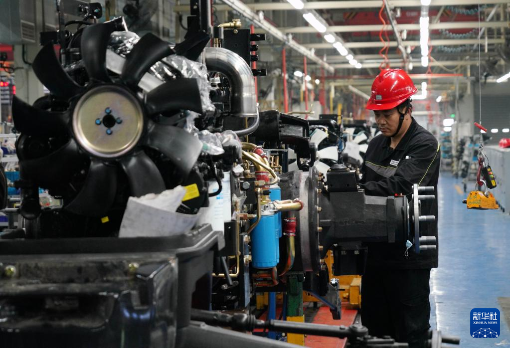 4月25日,在山东省临沂市临沭县一家机械制造企业,工人在车间内组装农机产品。新华社发(尹君 摄)