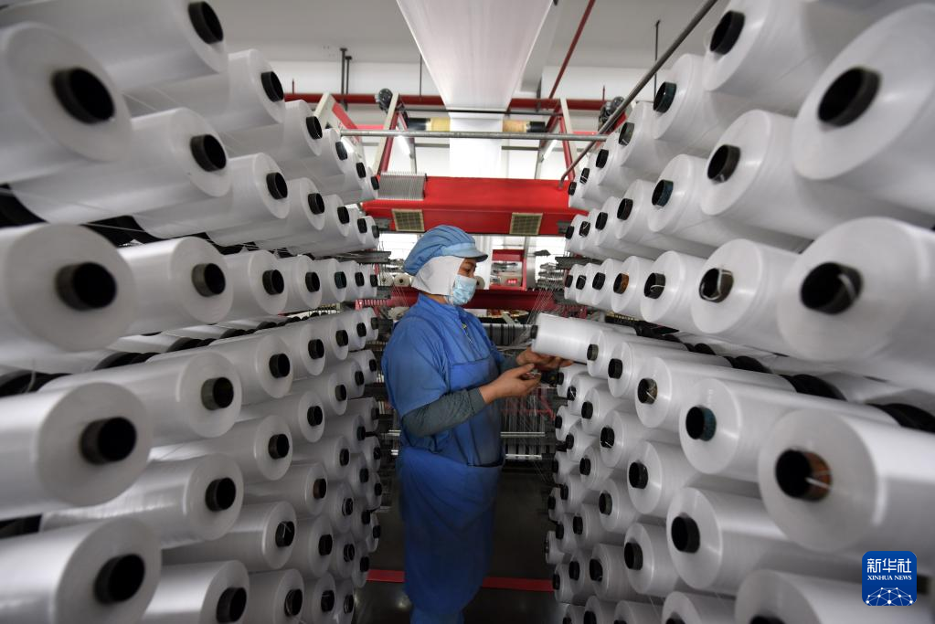 4月25日,在山东省临沂市临沭县一塑编企业车间,工人加工塑编产品。新华社发(王彦冰 摄)