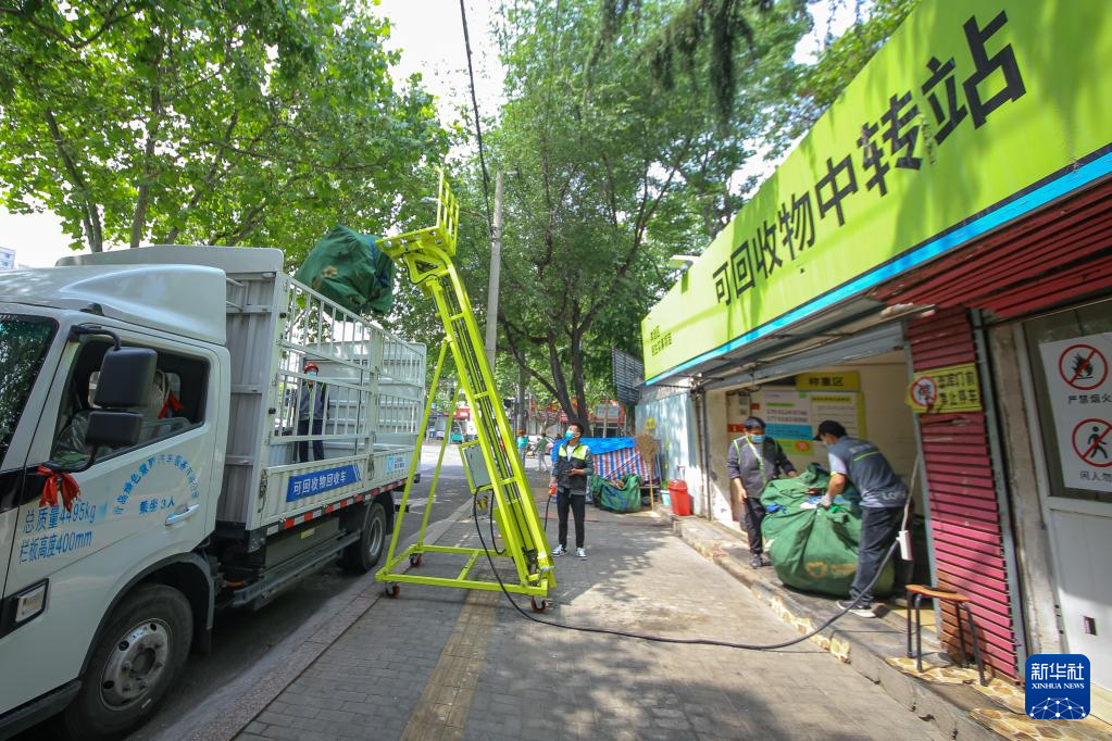6月2日,在山东省青岛市李沧区李村街道可回收物中转站,工作人员将可回收物装车。
