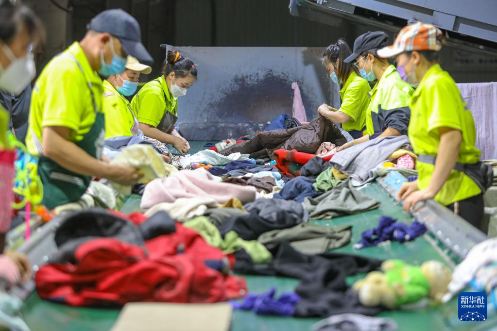 6月2日,工作人员在青岛市可回收物绿色分拣中心织物分拣工作台进行分拣作业。
