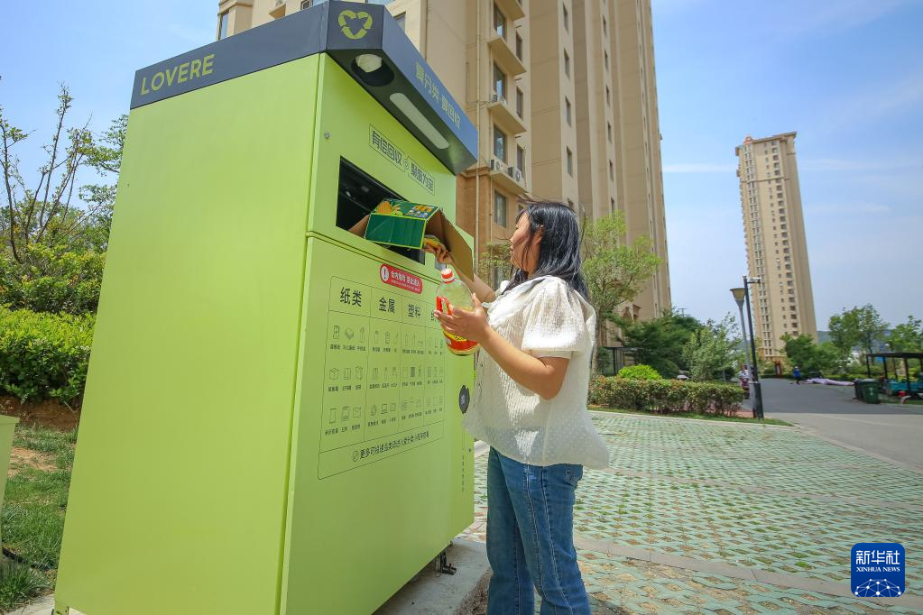 6月2日,在青岛市李沧区中南世纪城小区,居民将可回收物投放至智能回收箱。