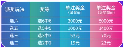 本次派奖活动除了设立选十中十、选九中九特别奖外,还设立特定玩法奖上奖,总奖金约3.09亿元,对选二、选三、选五、选六玩法进行派奖,具体派奖情况如下。