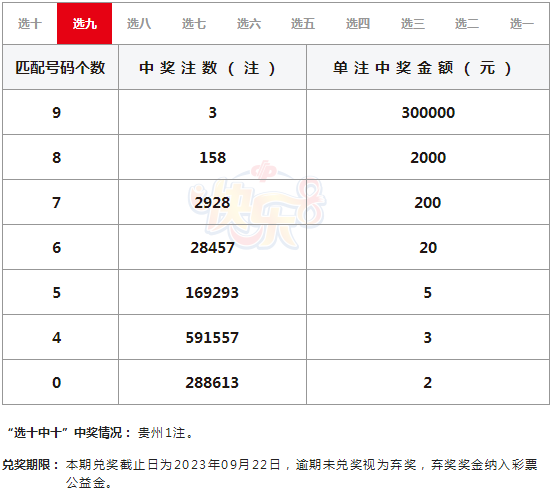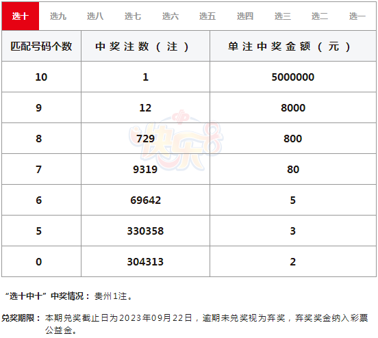 快乐8第2023195期,全国中出1注选十中十大奖,单注奖金500万元,大奖出自贵州。