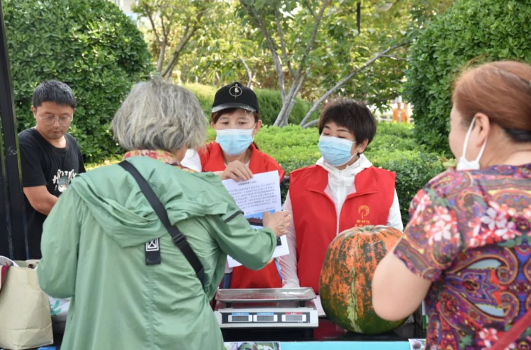 早上9点,街道新时代文明实践志愿者们就已经支好了摊位,为来往的市民朋友们热情介绍起来,新鲜的猕猴桃、小米、大南瓜、纯手工的特色煎饼及红薯粉皮等,都在吸引着来往市民们的光顾。