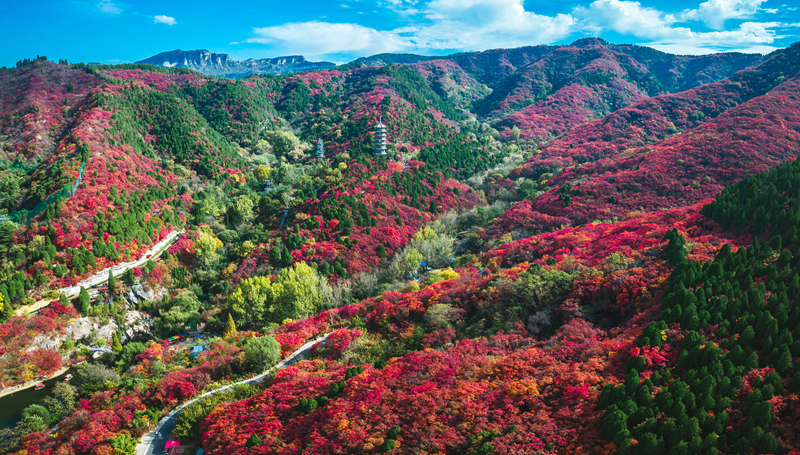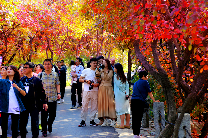 秋天的红叶谷。宛若童话世界,4000余亩黄栌树换上新装,如云似霞。登山万叶塔,俯瞰整个景区,漫山遍野的红叶从山顶蔓延开来,勾勒出一幅绝美的红叶画卷。漫步在环秀路,道路两旁铺满了红叶,让游客们流连忘返。(完)