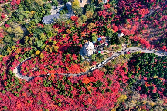 深秋降临,济南红叶谷披上了一层锦绣斑斓的华袍,阳光轻轻拂在4000余亩黄栌树上,照耀出如火如荼的漫山红叶。