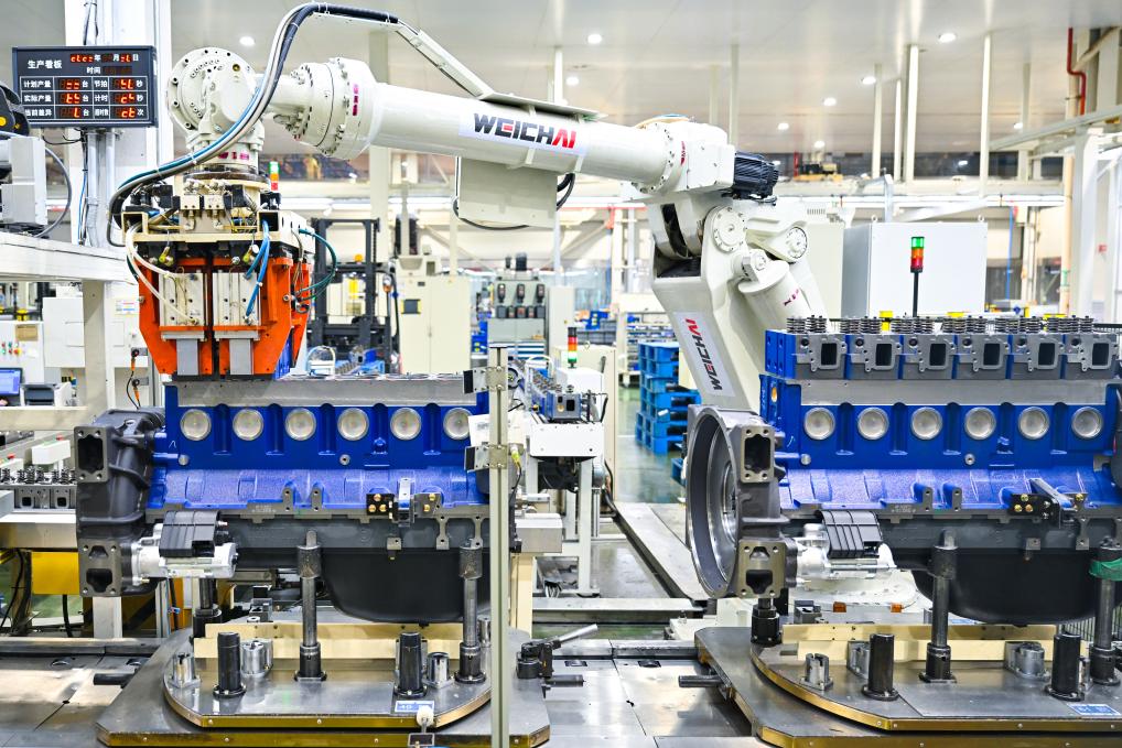 在潍柴动力股份有限公司总装生产线,机器人正在装配清洁能源发动机。(受访者供图)