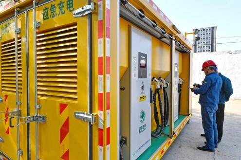 国网淄博供电公司员工巡视维护应急充电舱,保障新能源汽车绿色出行无忧。(袁德亮 摄)