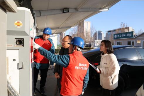 国网东营供电公司工作人员对充电桩进行巡视,确保充电设施可靠运行。(李恒发 摄)