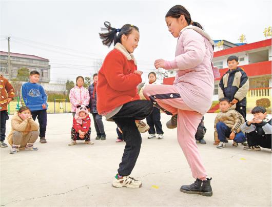 1月9日,山东省枣庄市山亭区水泉镇中心小学西校区开展“传统游戏健身”系列活动,组织小学生利用大课间、课后延时等时段,开展角力、背对背运球、老鹰捉小鸡等传统游戏,丰富他们的课余生活。图为小学生在参加传统“顶拐”游戏。