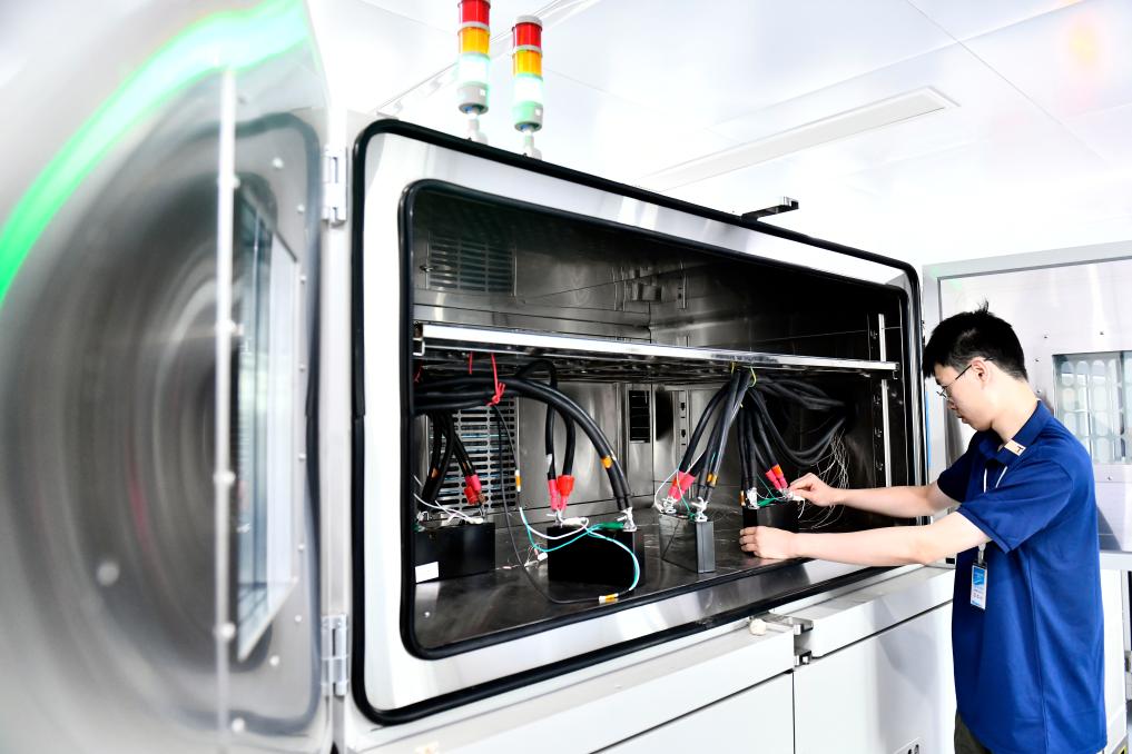 在枣庄市国家锂电池产品质量检验检测中心,工作人员对锂电池进行检验。新华社记者 郭绪雷 摄