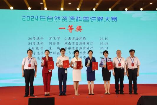 由山东省海洋局推荐的讲解选手——青岛贝壳博物馆苏飞宇,以第一名的成绩荣获2024年自然资源科普讲解大赛一等奖;省海洋局推荐的《“中国珍稀濒危海洋生物”科普丛书》,被评选为2024年自然资源优秀科普图书;省海洋局获2024年自然资源科普讲解大赛优秀组织奖。(完)