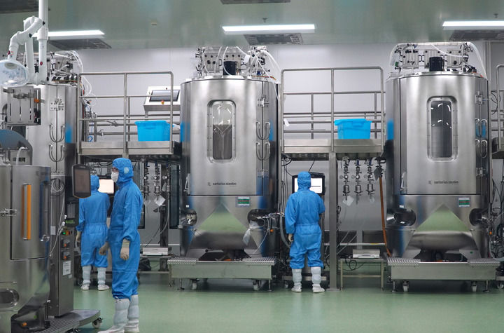 1月9日,在位于山东省烟台市黄渤海新区的荣昌生物制药(烟台)股份有限公司生产车间,工作人员正在进行生产操作。