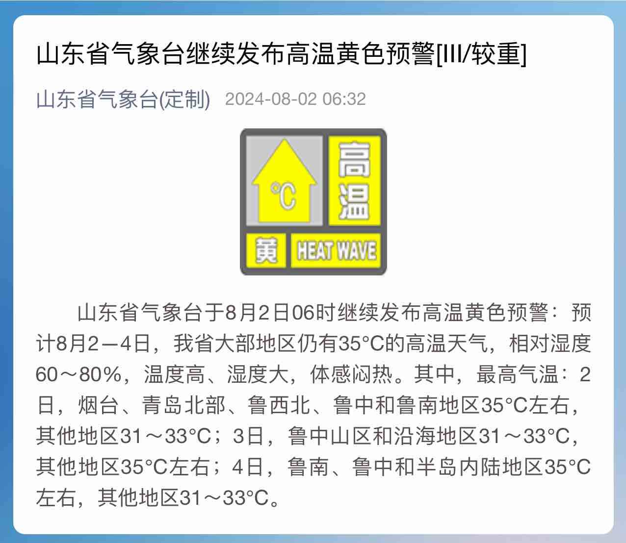 山东省气象台于8月2日06时继续发布高温黄色预警:预计8月2-4日,山东省大部地区仍有35°C的高温天气,相对湿度60~80%,温度高、湿度大,体感闷热。其中,最高气温:2日,烟台、青岛北部、鲁西北、鲁中和鲁南地区35°C左右,其他地区31~33°C;3日,鲁中山区和沿海地区31~33°C,其他地区35°C左右;4日,鲁南、鲁中和半岛内陆地区35°C左右,其他地区31~33°C。