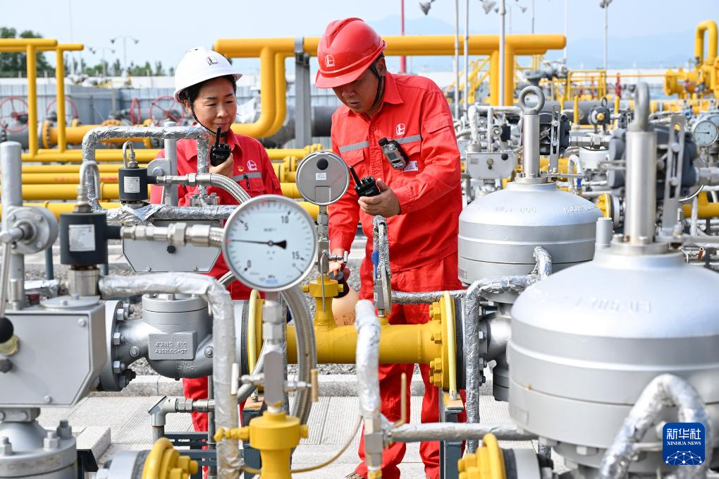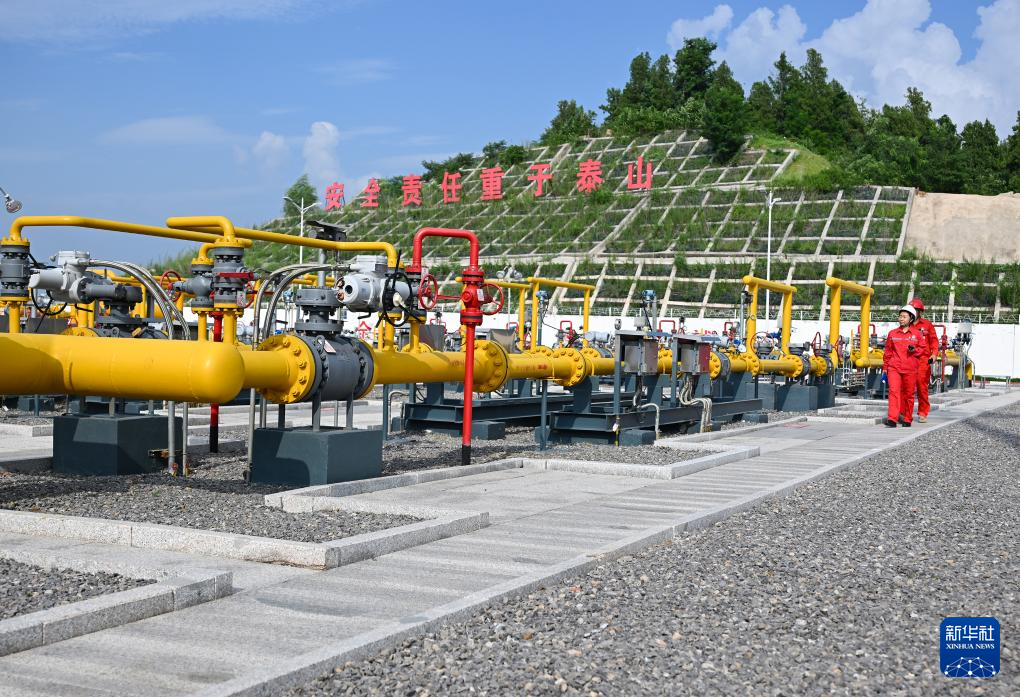 工作人员在章丘东分输站对站内运行中的天然气管道设备进行安检巡视(8月13日摄)。新华社记者 李贺 摄