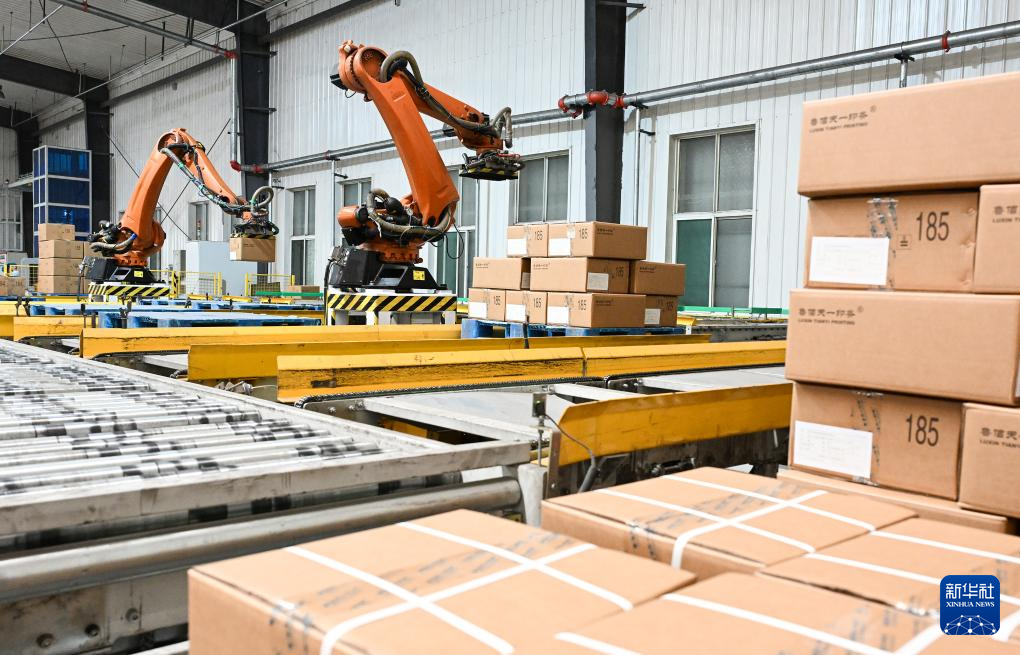 在位于济南市的山东鲁信天一印务有限公司包装车间内,机器人将打包好的产品自动码垛入库(8月14日摄)。新华社记者 李贺 摄