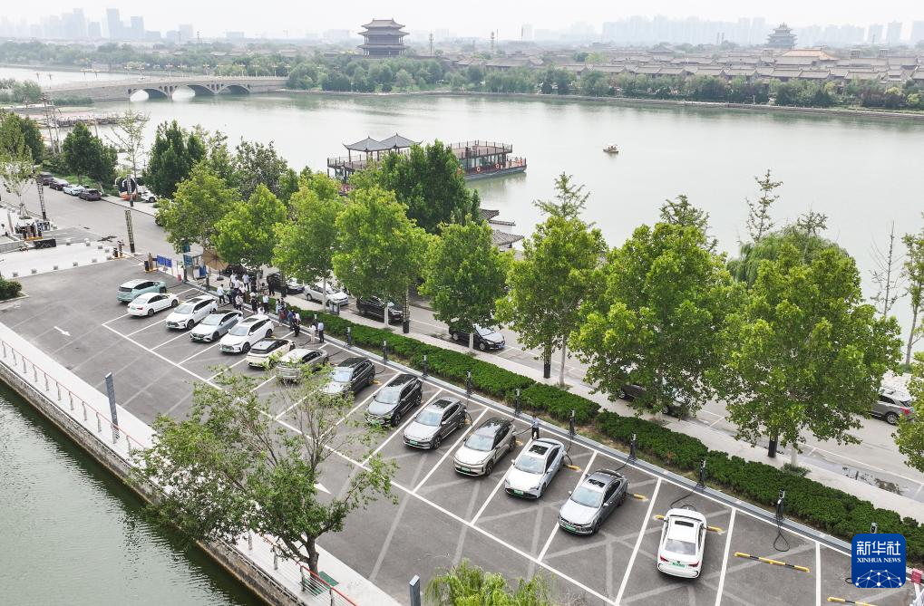 位于聊城东昌湖景区的时代广场充电站(8月15日摄,无人机照片)。新华社记者 李贺 摄