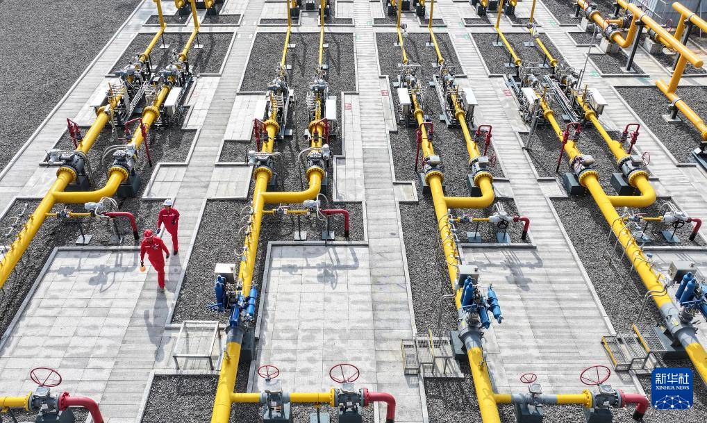 工作人员在章丘东分输站对站内运行中的天然气管道设备进行安检巡视(8月13日摄,无人机照片)。新华社记者 李贺 摄