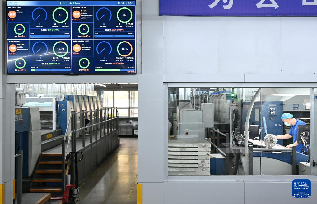 在位于济南市的山东鲁信天一印务有限公司印刷生产车间内,生产进度即时在显示屏上反馈显示(8月14日摄)。新华社记者 李贺 摄
