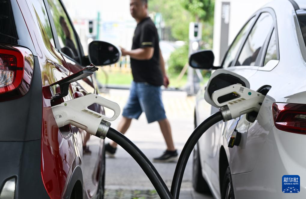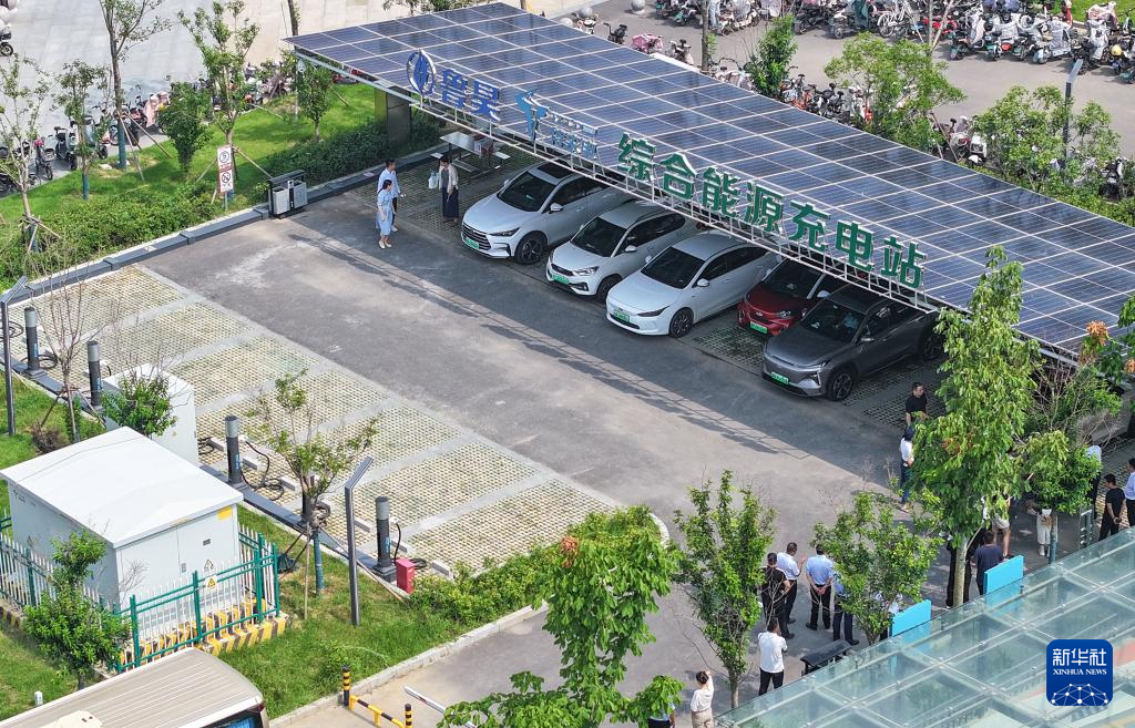 不同品牌的新能源汽车在位于聊城图书馆旁的“光储充放检”综合能源充电站充电(8月15日摄)。新华社记者 李贺 摄
