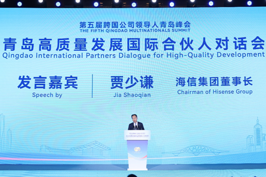 8月28日下午,第五届跨国公司领导人青岛峰会——青岛高质量发展国际合伙人对话会在青岛举行。海信集团董事长贾少谦受邀作为青岛跨国公司企业代表发言。他表示,海信对全球化的信心坚定不移,对跨国公司之间的合作共赢坚信不移。