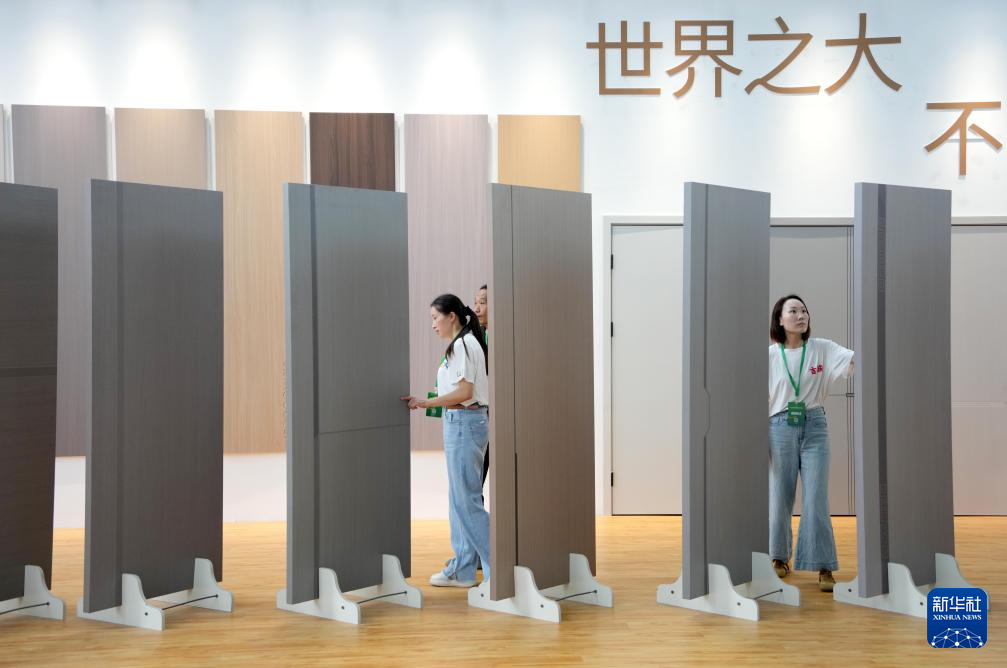 9月19日在第十九届中国林产品交易会上拍摄的木门。新华社记者 徐速绘 摄