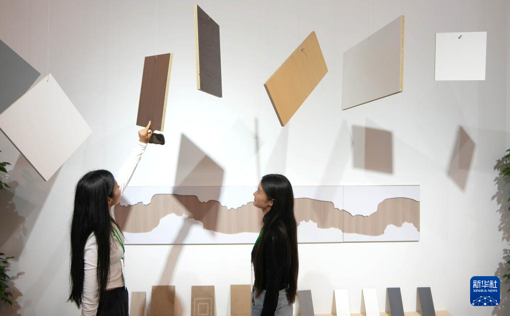 9月19日,参展商在第十九届中国林产品交易会上展示木加工产品。新华社记者 徐速绘 摄