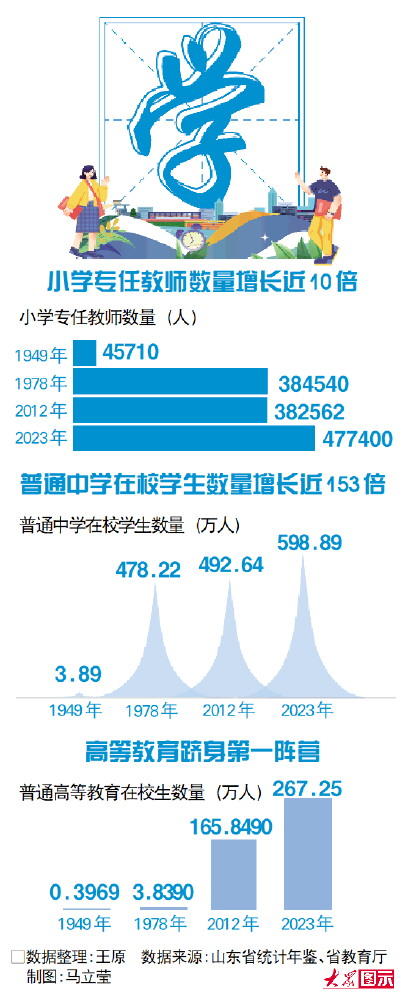 如今,这样的统计数据不仅发生巨大量变,更发生了质的变化:山东小学在校生增加至812.09万人,初中学校增加至3327所、在校生增加至400.35万人,高中学校增加至782所、在校生增加至198.54万人。义务教育巩固率和高中教育普及化水平均保持高位。