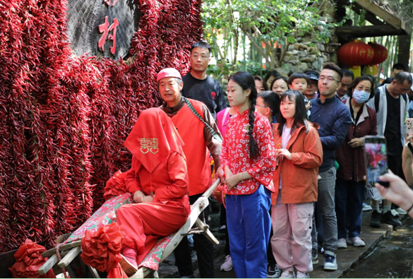 10月2日,游客参加竹泉村“民俗婚嫁表演”活动(李金鑫 摄)