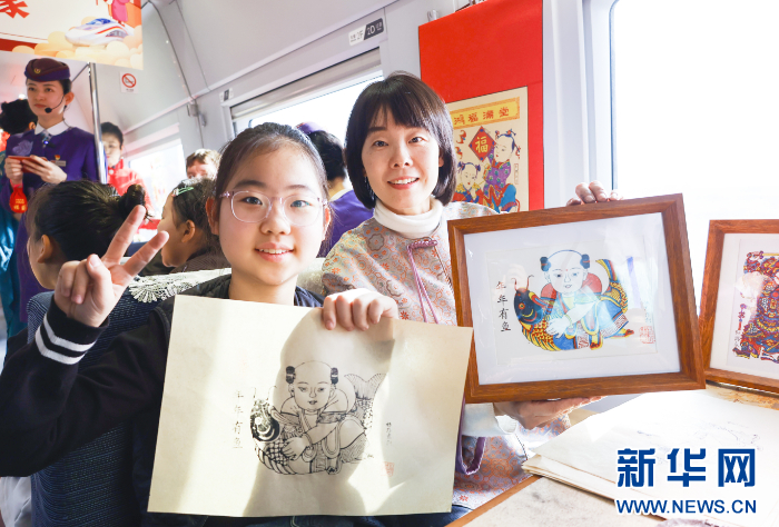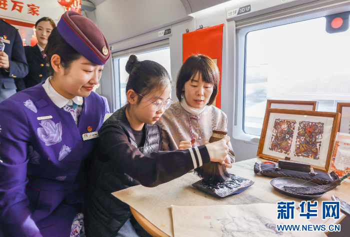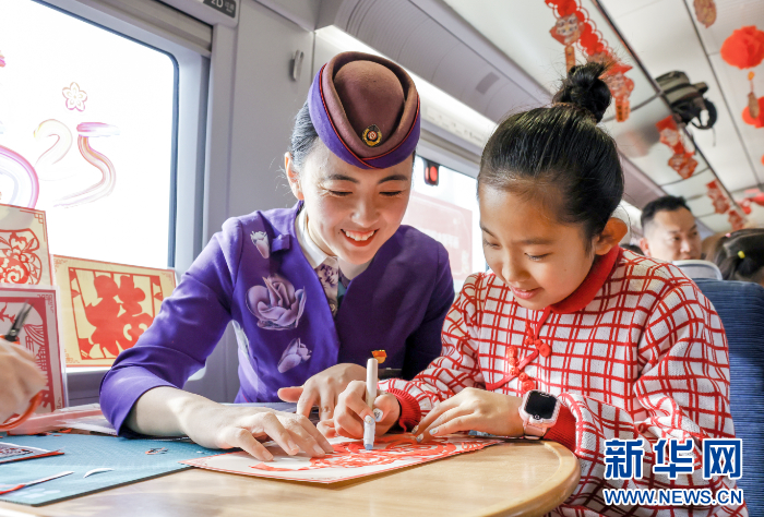 乘务员与小旅客共同体验中国民间传统装饰艺术——刻纸。新华网发
