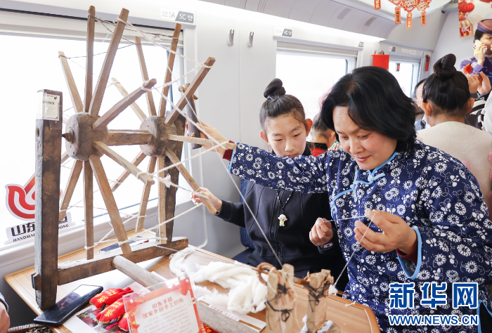 在G1088次列车上,小旅客在非遗传承人孙春香(右一)指导下,体验手工纺织。新华网发