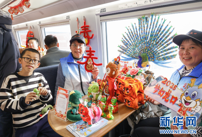 黄县面塑非遗传承人傅喜娜(右一)将作品《孔雀开屏》带上高铁。新华网发