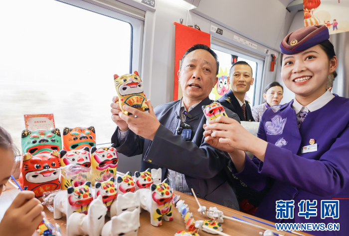 聂家庄第21代泥塑传承人聂臣希(左一)与列车工作人员展示泥老虎作品。新华网发