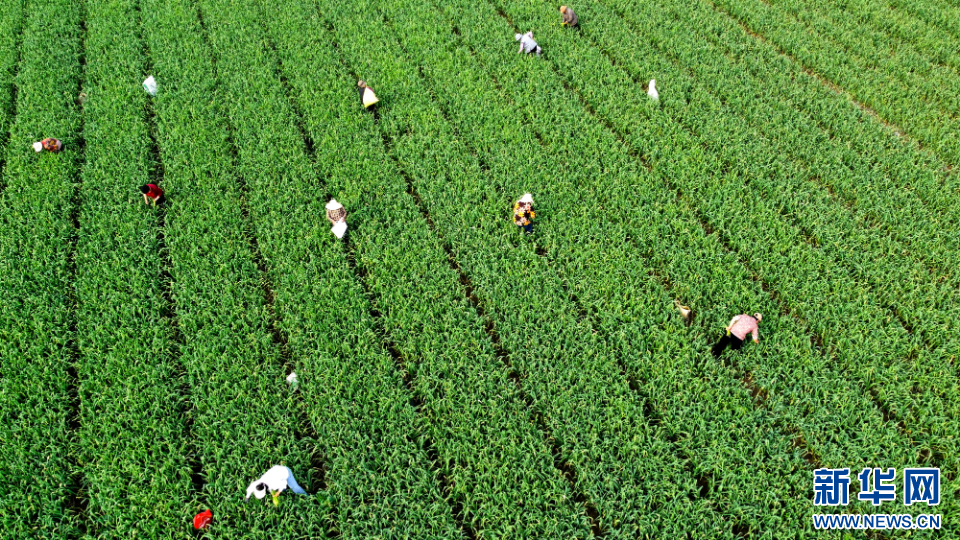 大蒜种植户在蒜田里采收蒜薹。新华网发(张乐民 摄)