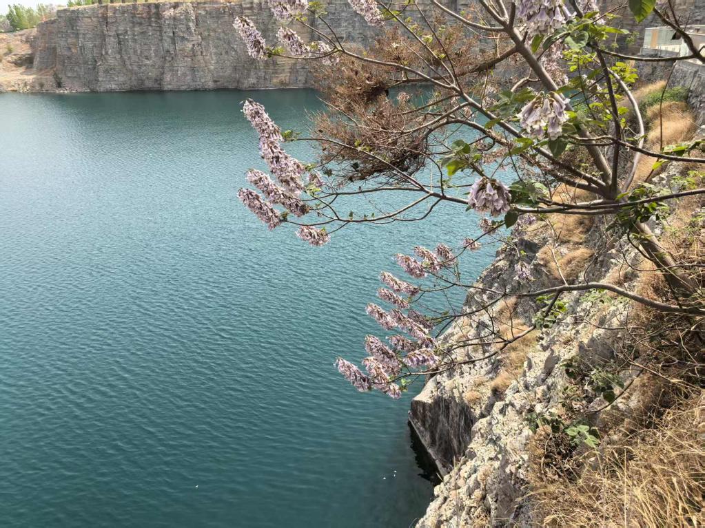 在山东菏泽巨野县核桃园镇白虎山天池,开阔的水面碧波荡漾,陡峭石岸边淡紫色的泡桐花迎风绽放,远处惊险刺激的玻璃栈道上不时传来游客的惊呼和嬉笑声。