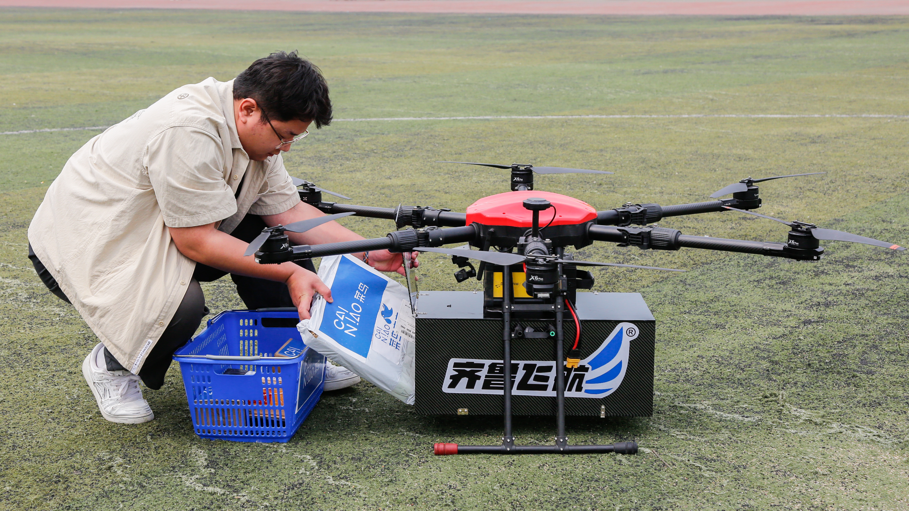 5月22日上午10时,一架中型多旋翼六轴无人机载着10个快递包裹,从章丘大学园区空天信息大学(筹)出发,仅用5分钟便穿越2公里航线,精准降落在济南工程职业技术学院。这标志着该校与菜鸟物流联合打造的无人机派送快递服务正式投入试运行,成为山东省低空经济应用场景落地校园的创新范本。