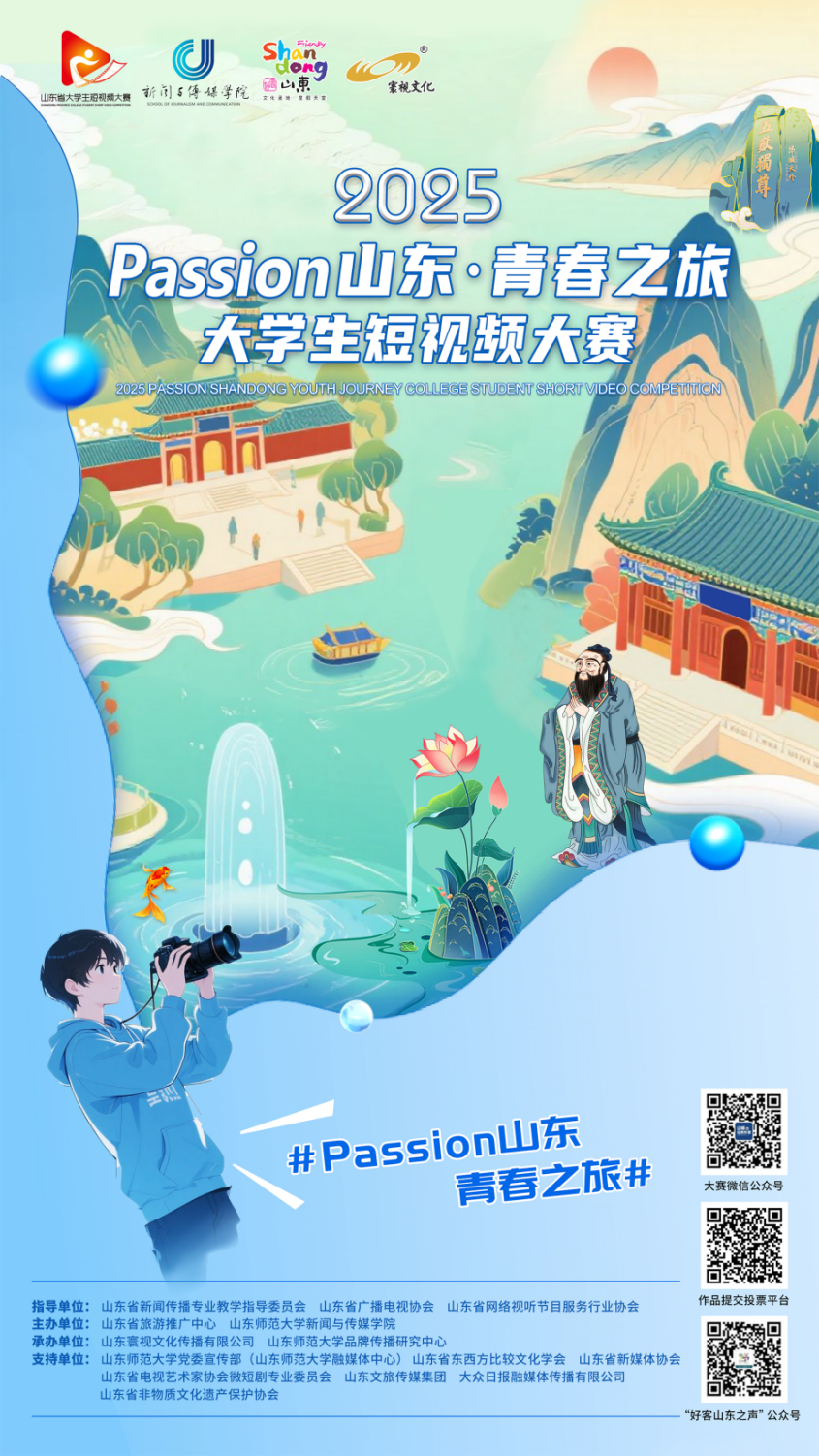 近日,由山东省旅游推广中心与山东师范大学新闻与传媒学院联合主办的“2025Passion山东·青春之旅”大学生短视频大赛启动,现面向全省高校在校生征集创意作品。赛事旨在通过大学生的青春视角展现山东的文化魅力、历史底蕴与现代活力,让传统文化焕发新的生机。