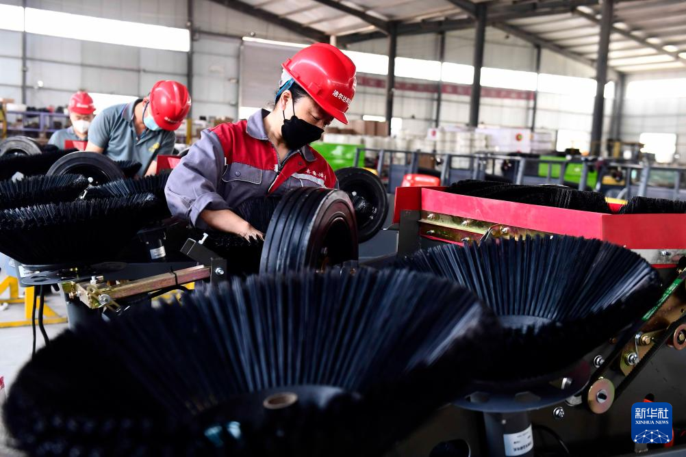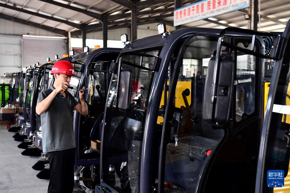 5月29日,工作人员在郓城县张营街道一家企业的清扫车生产线忙碌。新华社记者 郭绪雷 摄