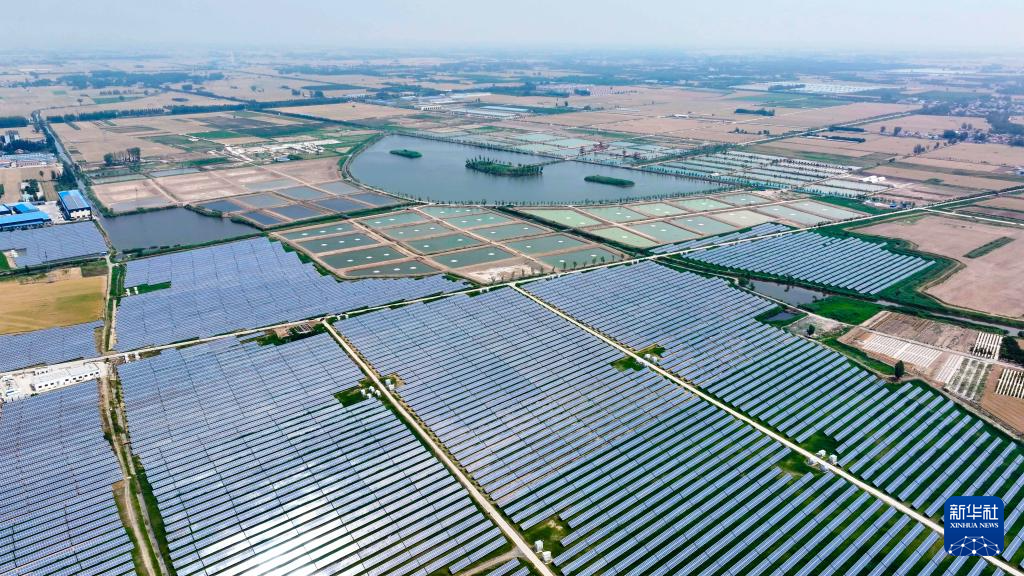 这是5月29日拍摄的郓城县张营街道乡村振兴示范园里的光伏发电项目(无人机照片)。该项目对彭庄煤矿塌陷区进行了“农业+”“生态+”综合开发利用。新华社记者 郭绪雷 摄