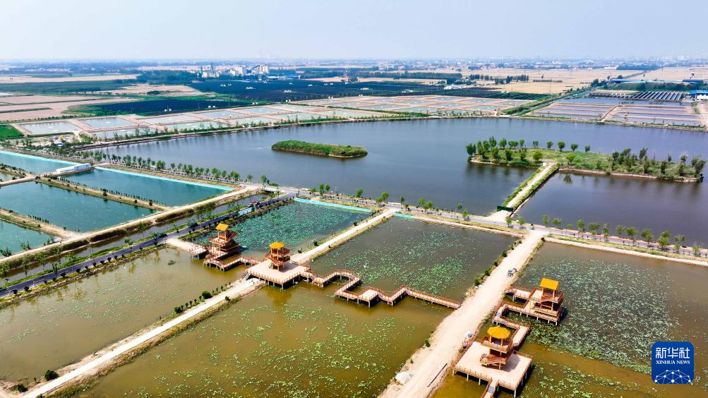 这是5月29日拍摄的郓城县张营街道乡村振兴示范园里的鱼塘和藕池(无人机照片)。该项目对彭庄煤矿塌陷区进行了“农业+”“生态+”综合开发利用。新华社记者 郭绪雷 摄