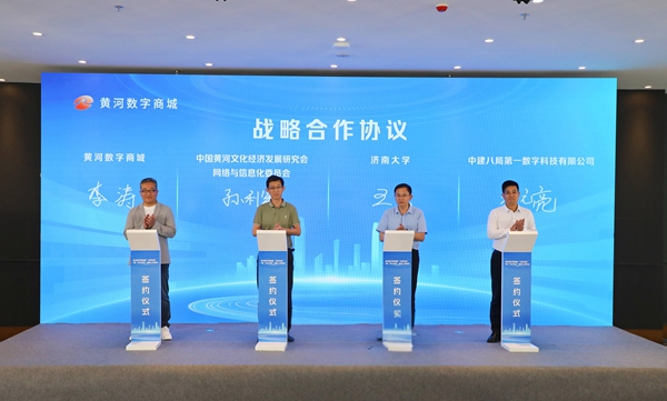 活动中,黄河数字商城与中国黄河文化经济发展研究会、济南大学、中国中丝集团有限公司、中建八局第一数字科技有限公司现场达成并签订战略合作协议;与会嘉宾依次上台为黄河数字商城揭牌,同步揭幕新零售智能终端“神秘面纱”,并为“第一书记优选”“天桥优品”两大品牌启动上线。