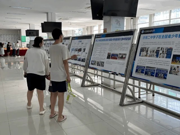 在咨询处一侧,与科学教育相关的展板吸引了不少考生和家长驻足。济南二中以“美育+科技”为主要办学特色,这里展示了学校科学教育课程和成果,彰显了济南二中科学教育的办学成效。
