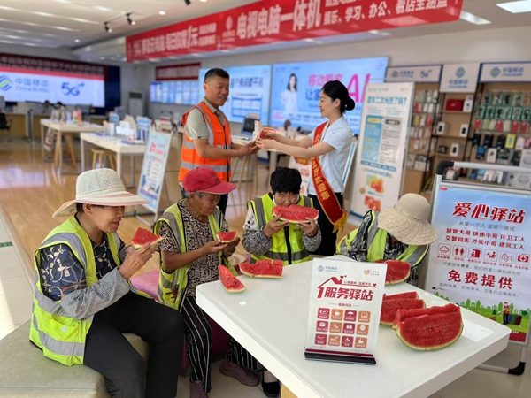 近日,枣庄市迎来了持续高温天气,部分地区气温最高达38度,给户外工作的环卫工人带来了严峻挑战。山东移动薛城分公司移动营业厅为一线“城市美容师”设立“爱心驿站”,并送上了清凉解暑的西瓜。