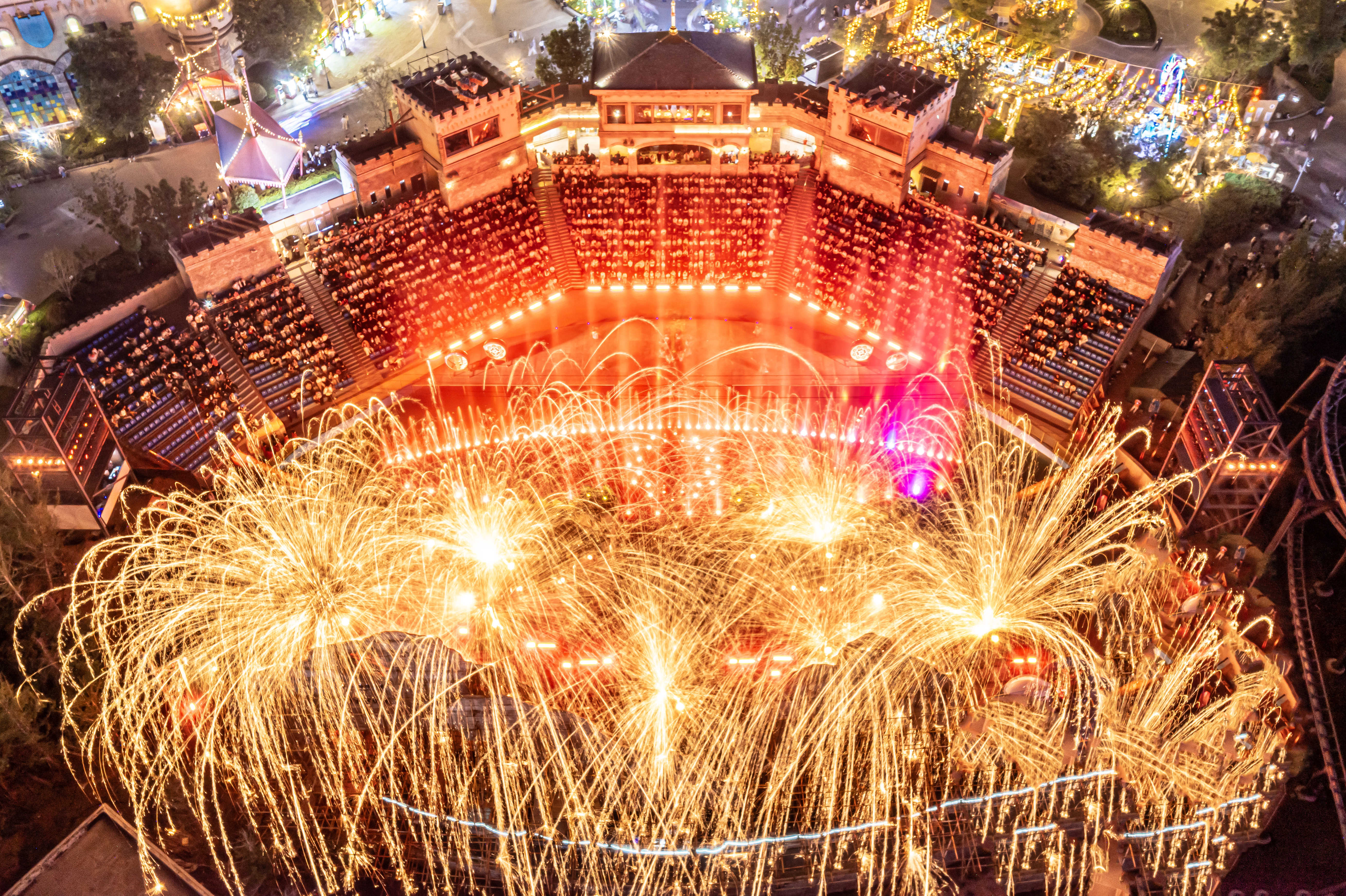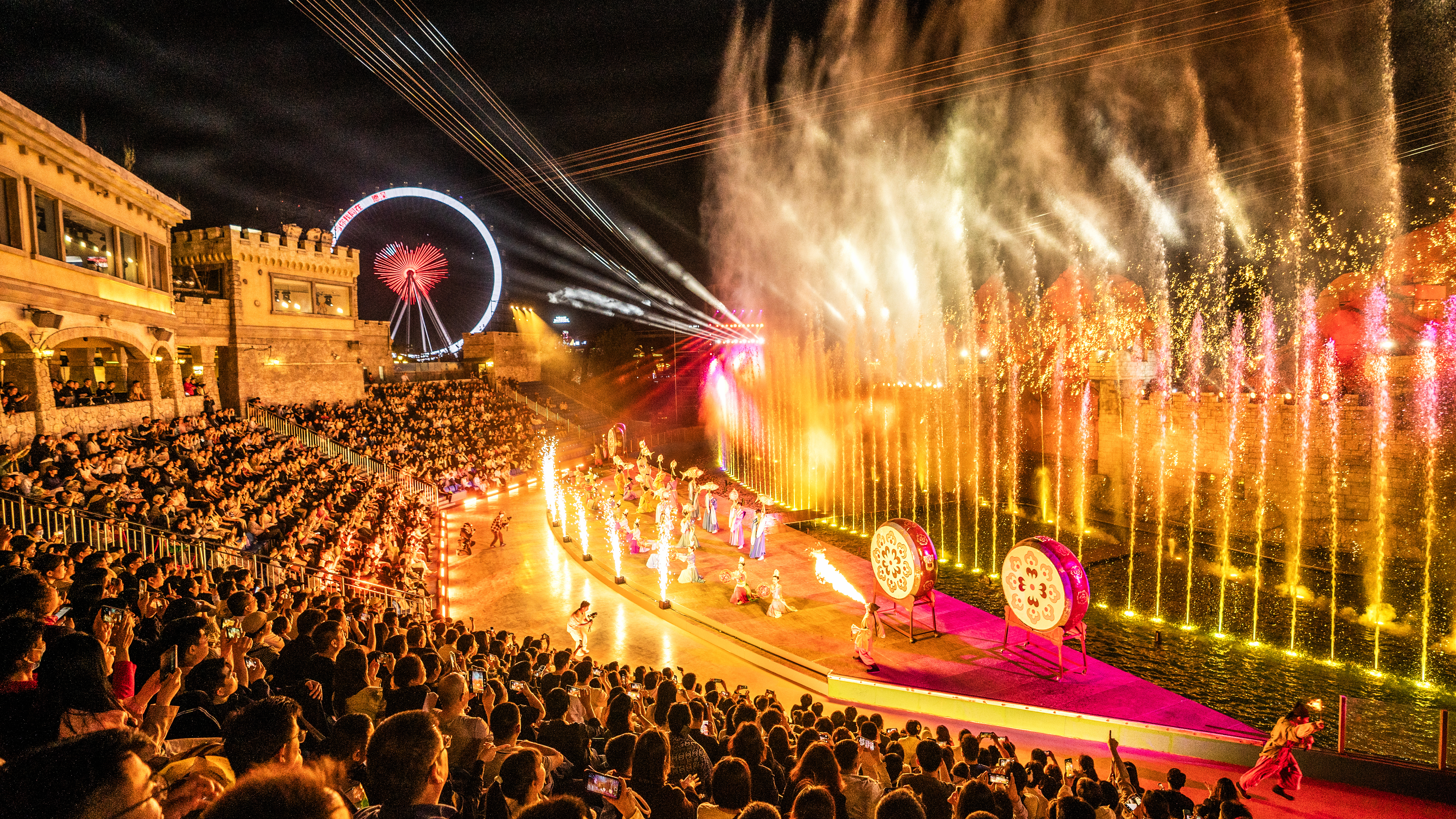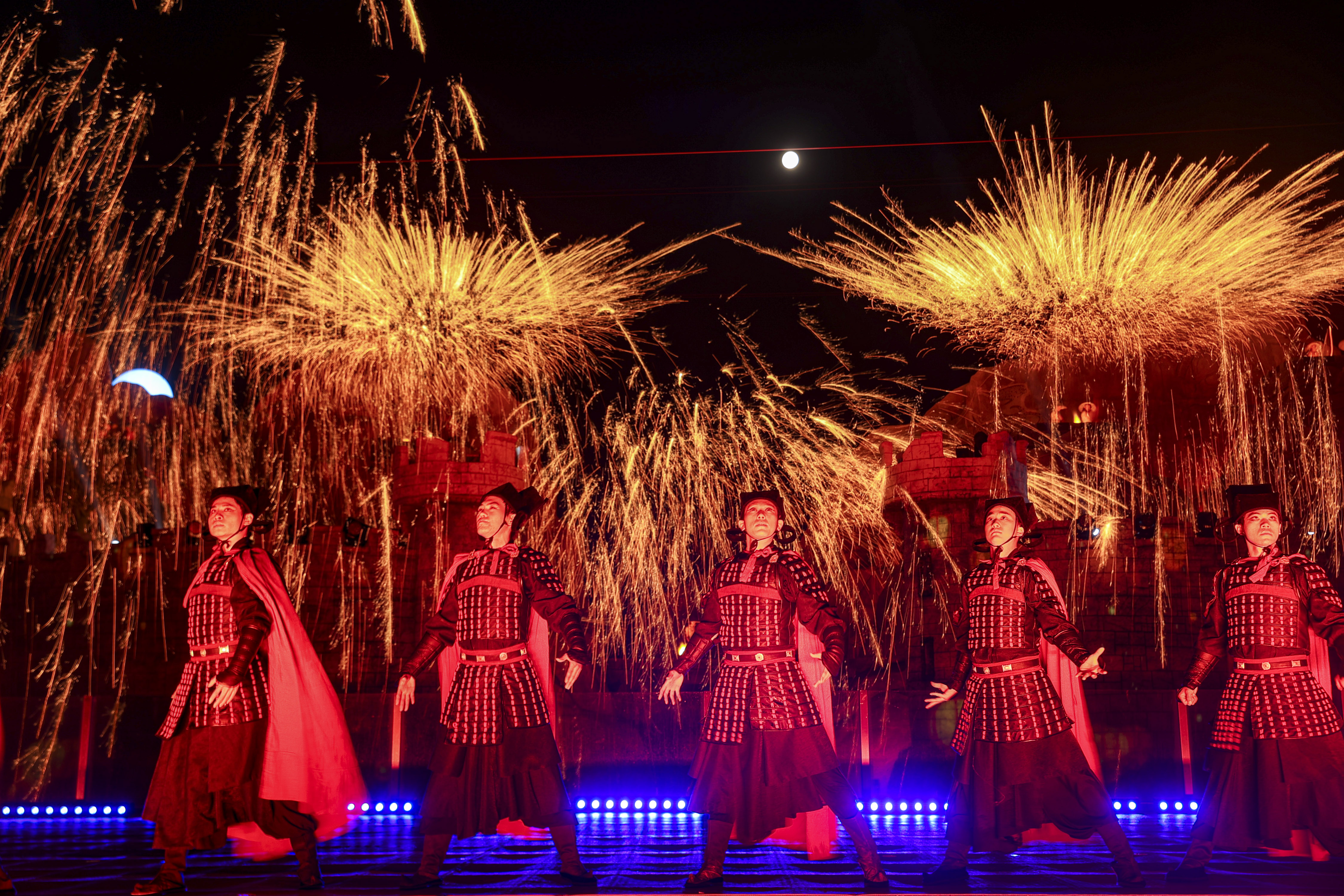让历史和现场产生共振,让剧目和游客产生共鸣,济南融创文旅城的绝招是“传统与现代的融合”。千年传承的铁花、火壶绝技,与现代的激光、水幕、威亚交相辉映,碰撞出“火树银花不夜天”的宋代景观。比如:为了表现战场上的激烈厮杀之感,除了演员和声光电的配合之外,烟、油、火的利用也非常“打眼”。