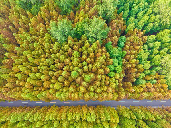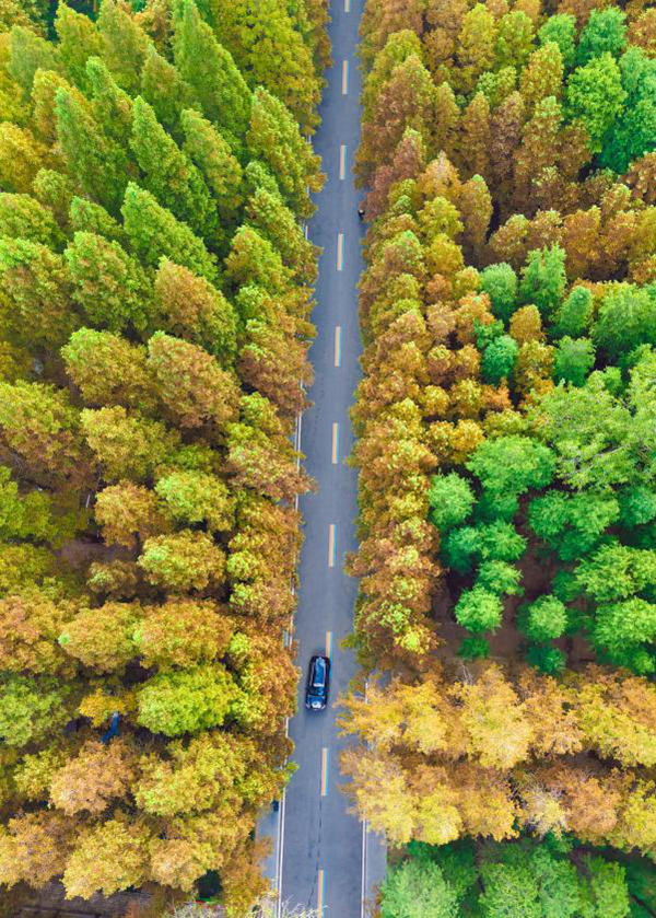 千余亩水杉渐染金黄,公路穿林而过,驾车穿梭,邂逅秋日限定浪漫。宋年升 摄