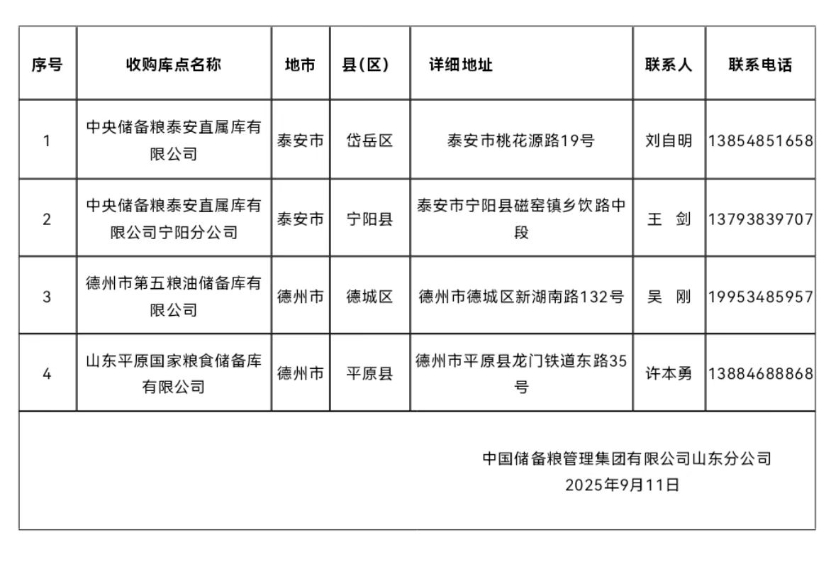 根据《国家粮食和物资储备局关于在江西山东两省启动2025年最低收购价执行预案的通知》,自2025年8月9日起在山东省内符合条件的地区启动小麦最低收购价执行预案。现将第九批收购库点公告如下: