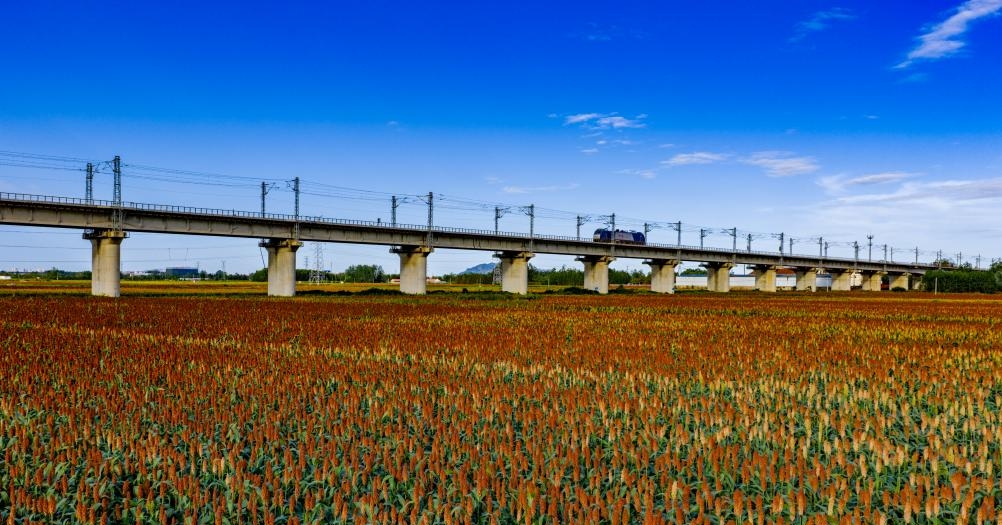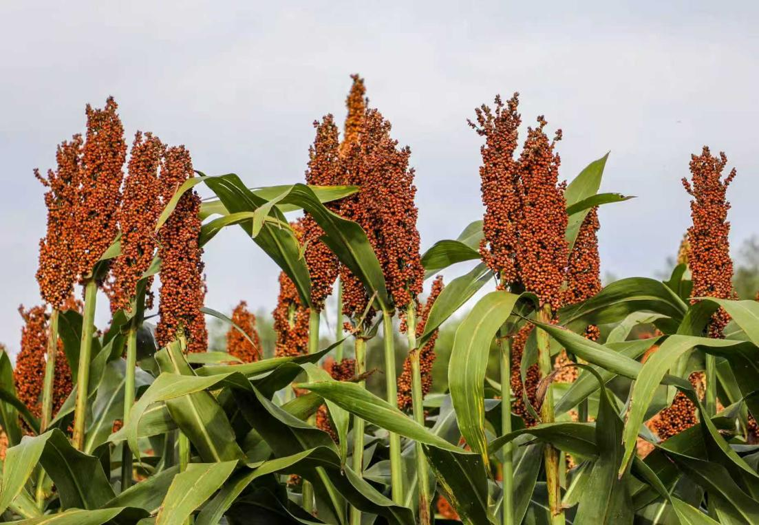 阳光洒在高粱田上,饱满的颗粒裹在绛红色的壳里泛着油亮的光泽。新华网发(刘宗丽 摄)