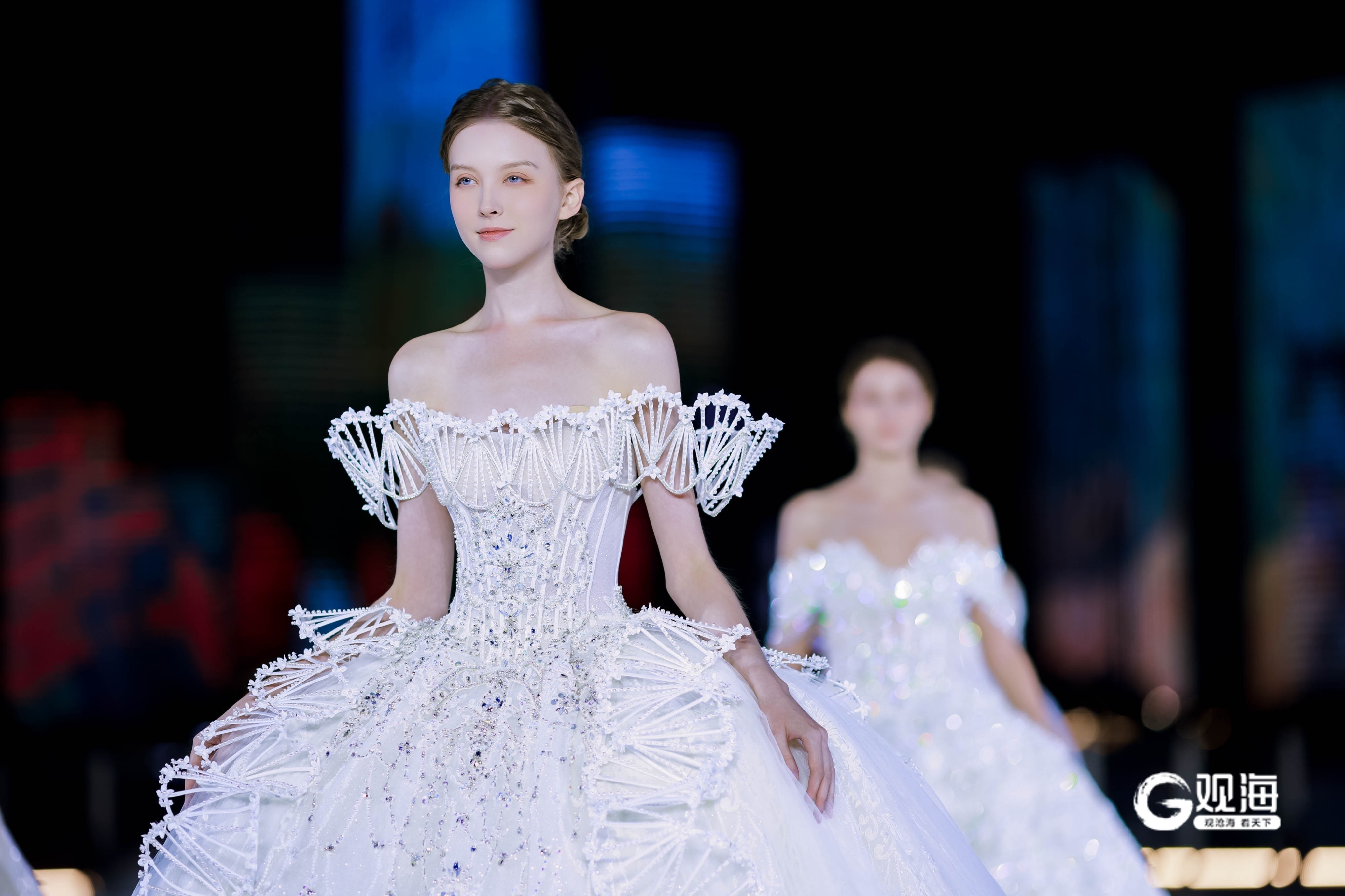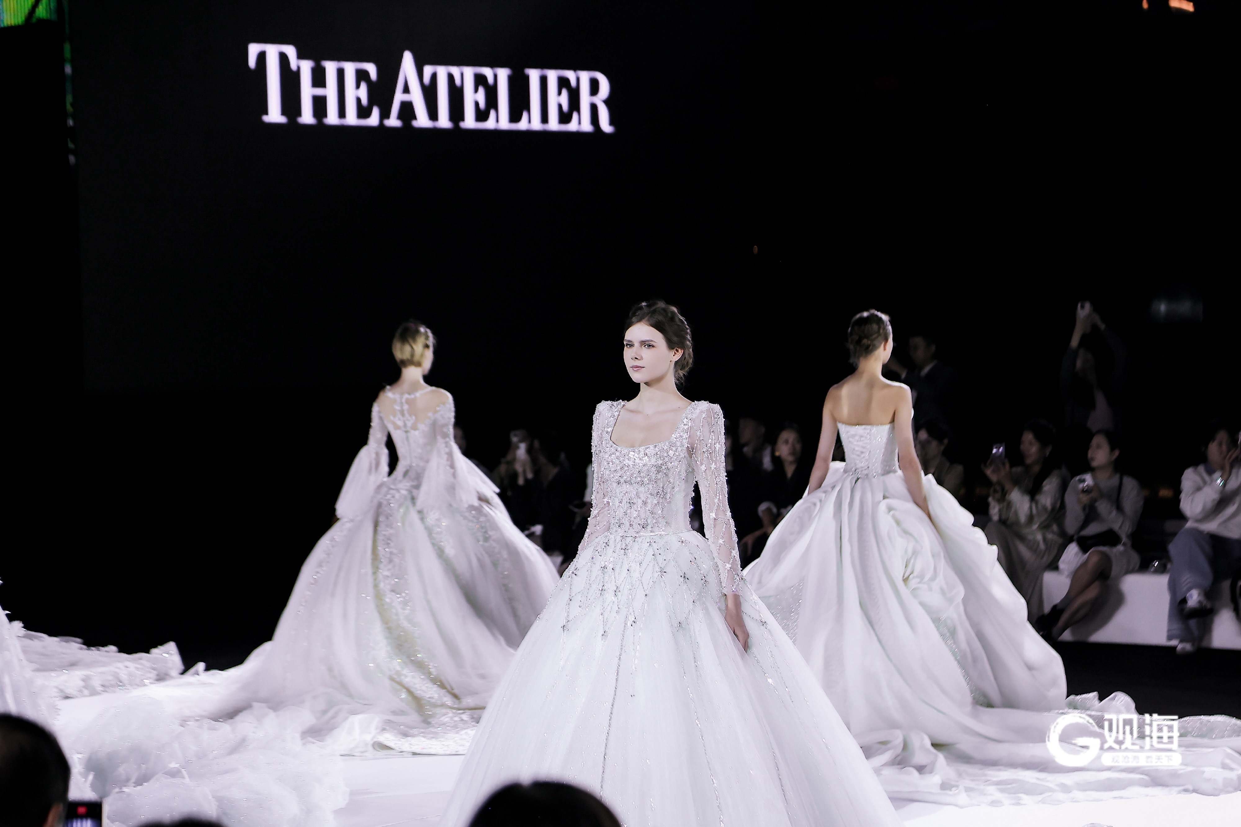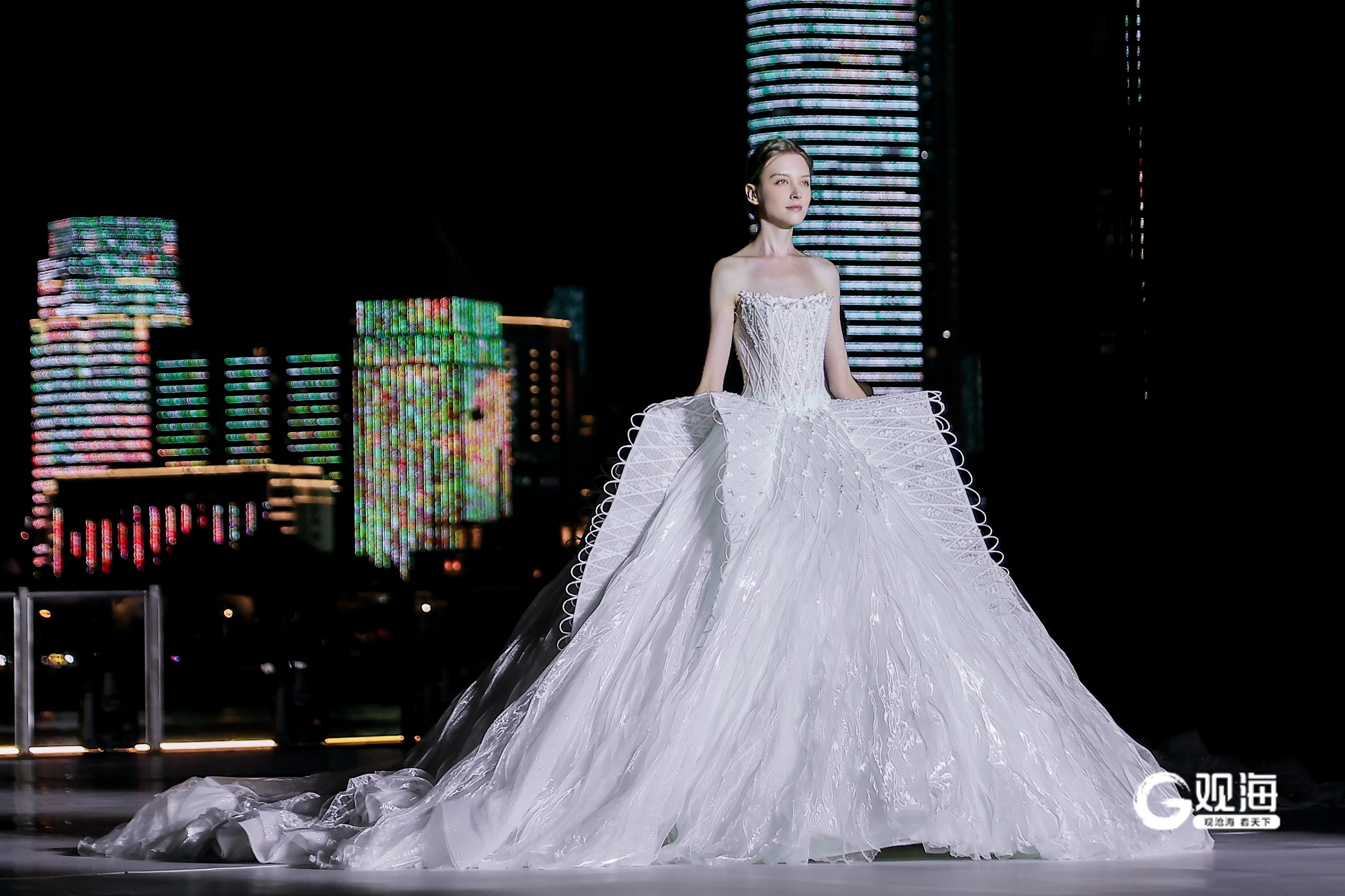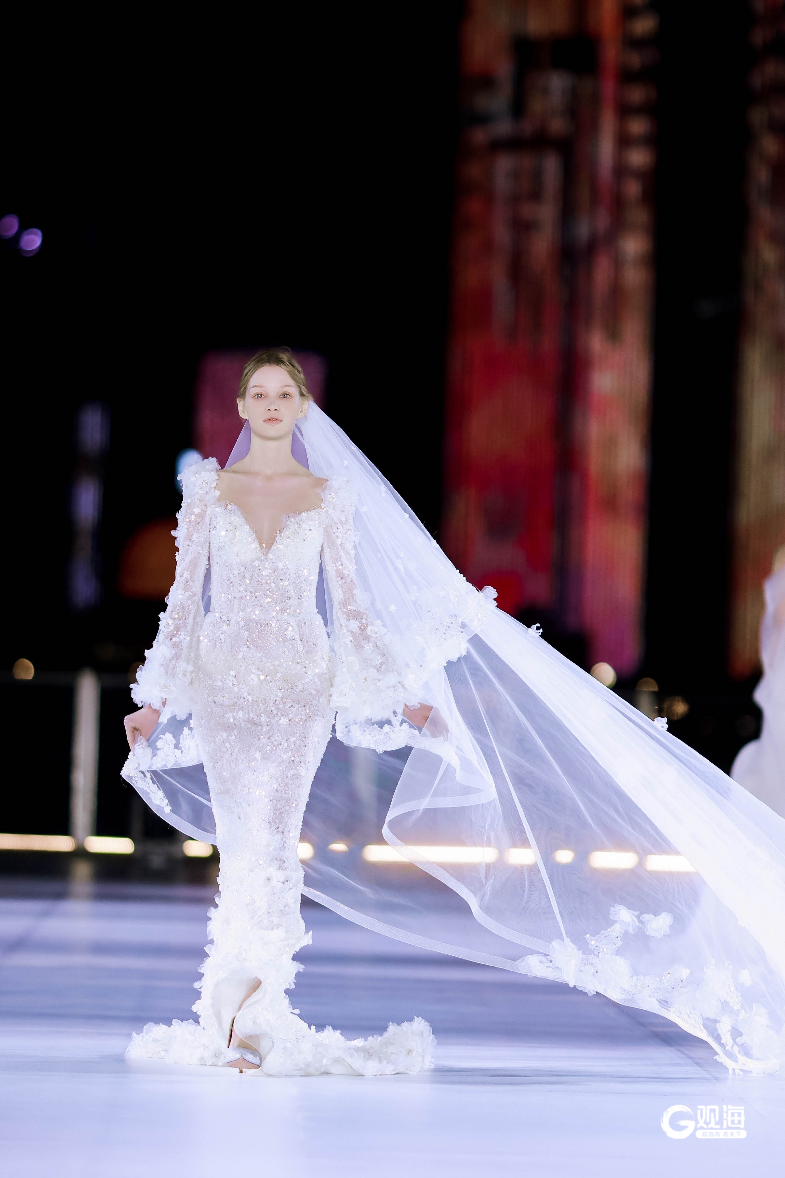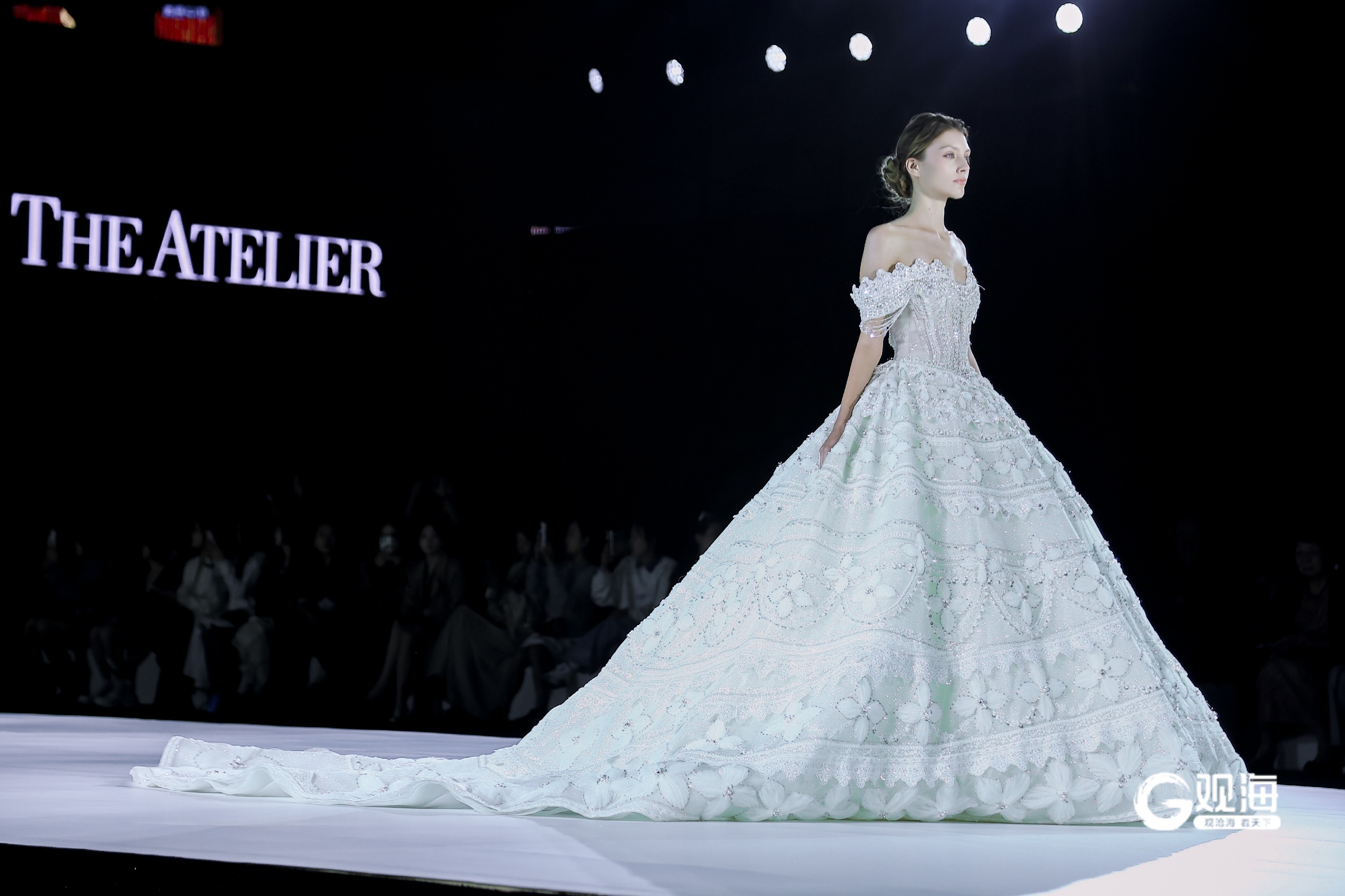 开幕秀由来自马来西亚吉隆坡的国际高端礼服婚纱品牌The Atelier带来,发布品牌2026春夏婚纱系列“羽翼生花Fleurs Crues Plumes”。该系列以简约奢华的设计诠释清丽、自由与浪漫。奥帆中心“海上剧场”上搭起的T台上,光影与裙缦轻纱在海天之间营造出旖旎的美学境界,模特们宛如从云端飘落的仙子,细腻的蕾丝如同轻柔的云雾,让观众感受到婚纱的浪漫与诗意。