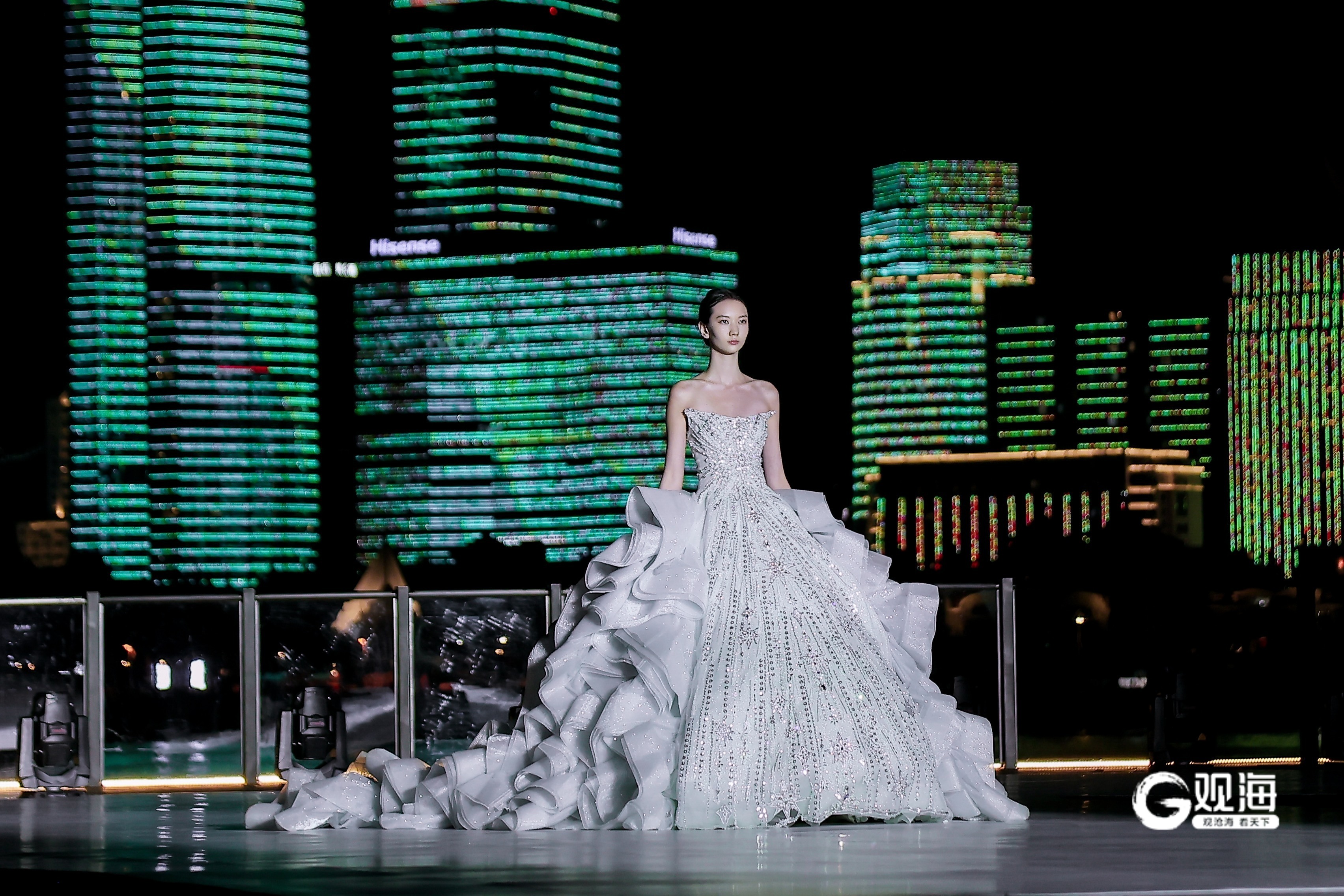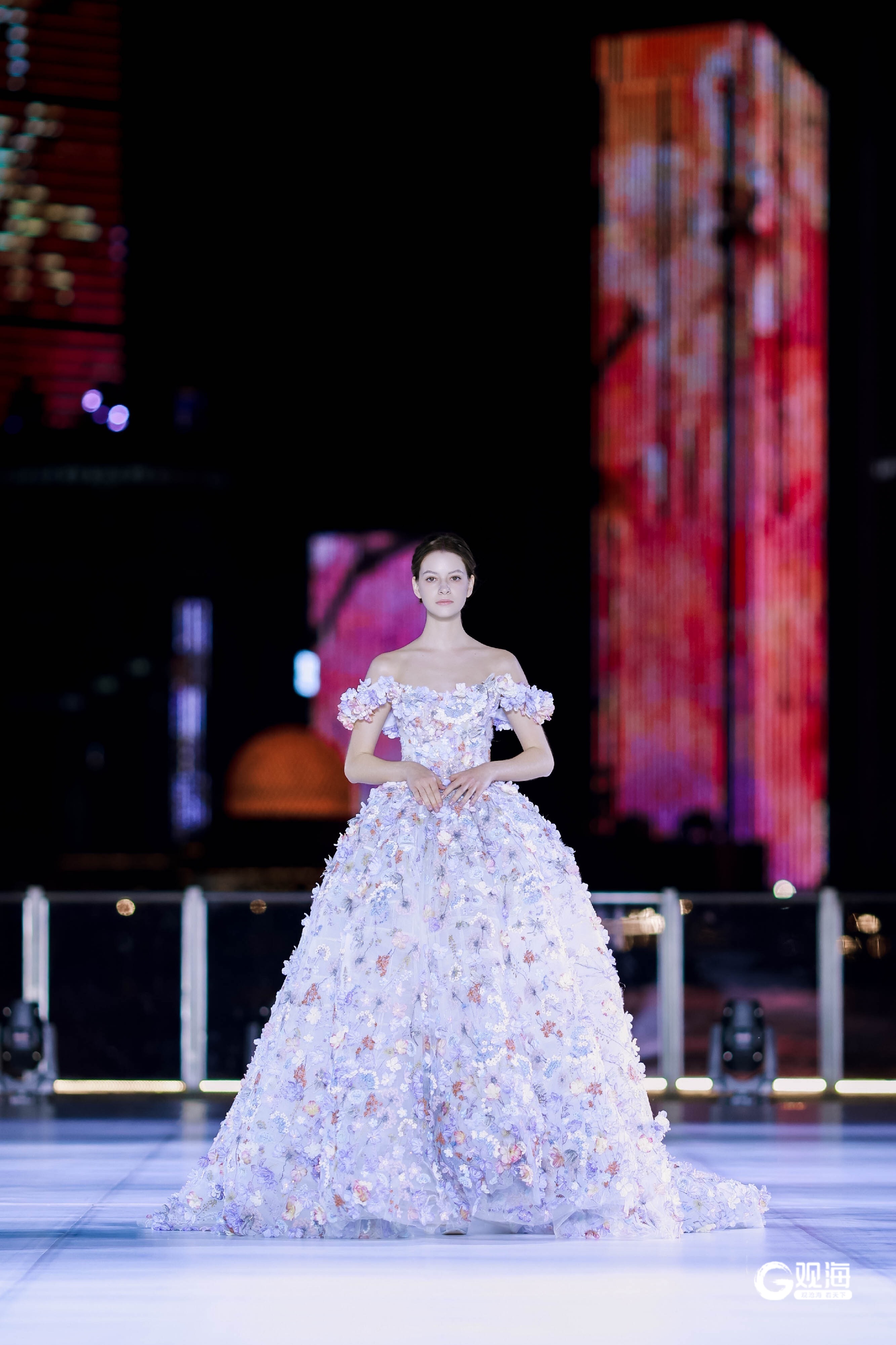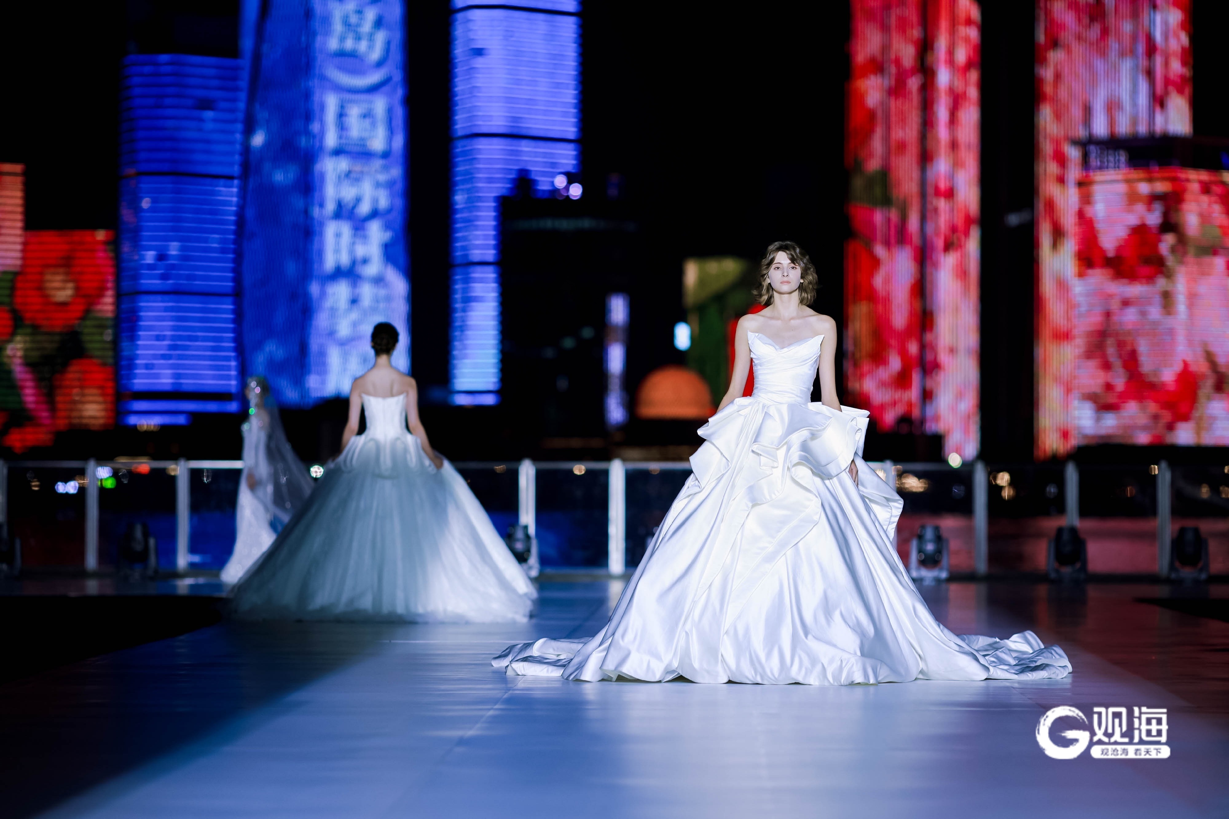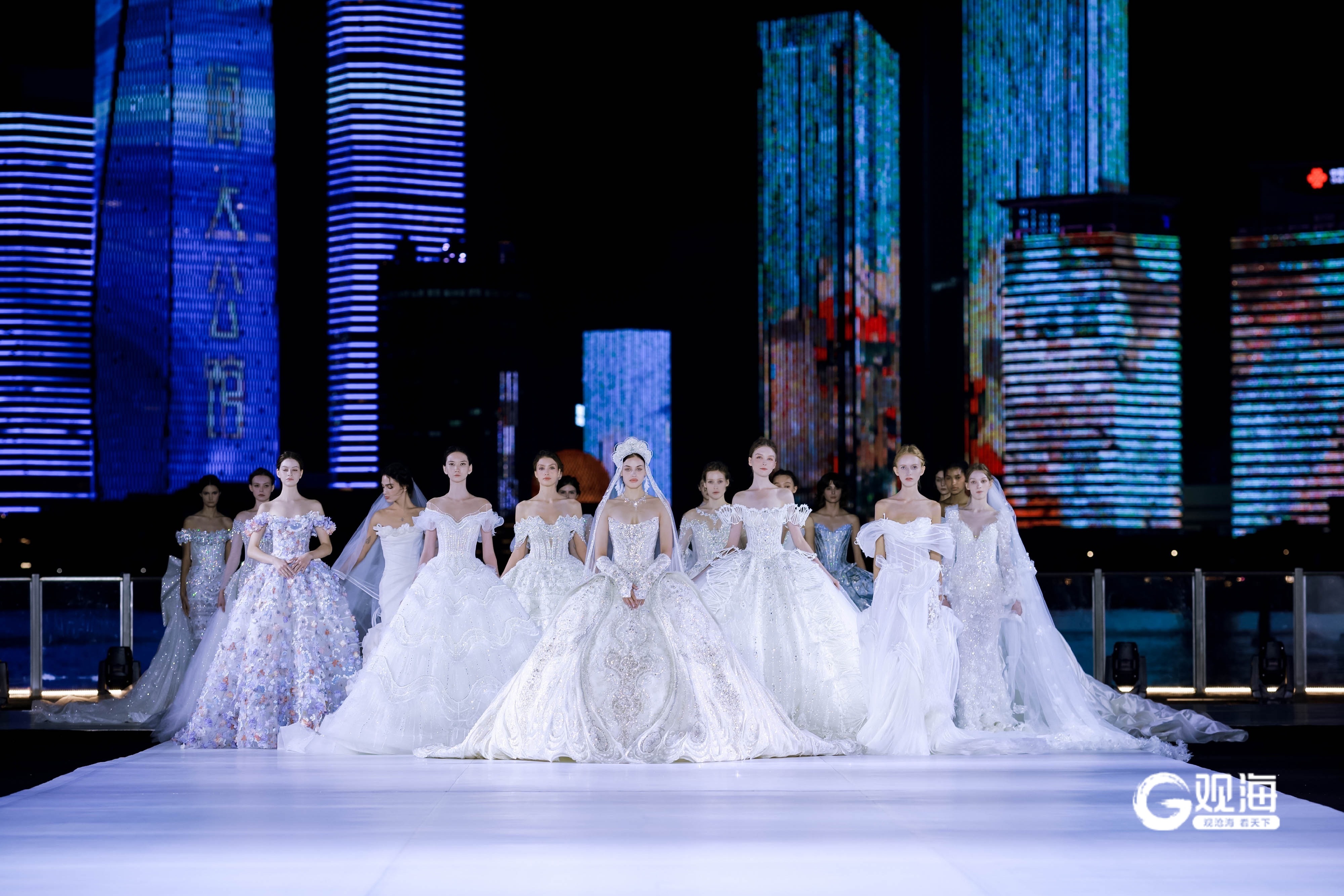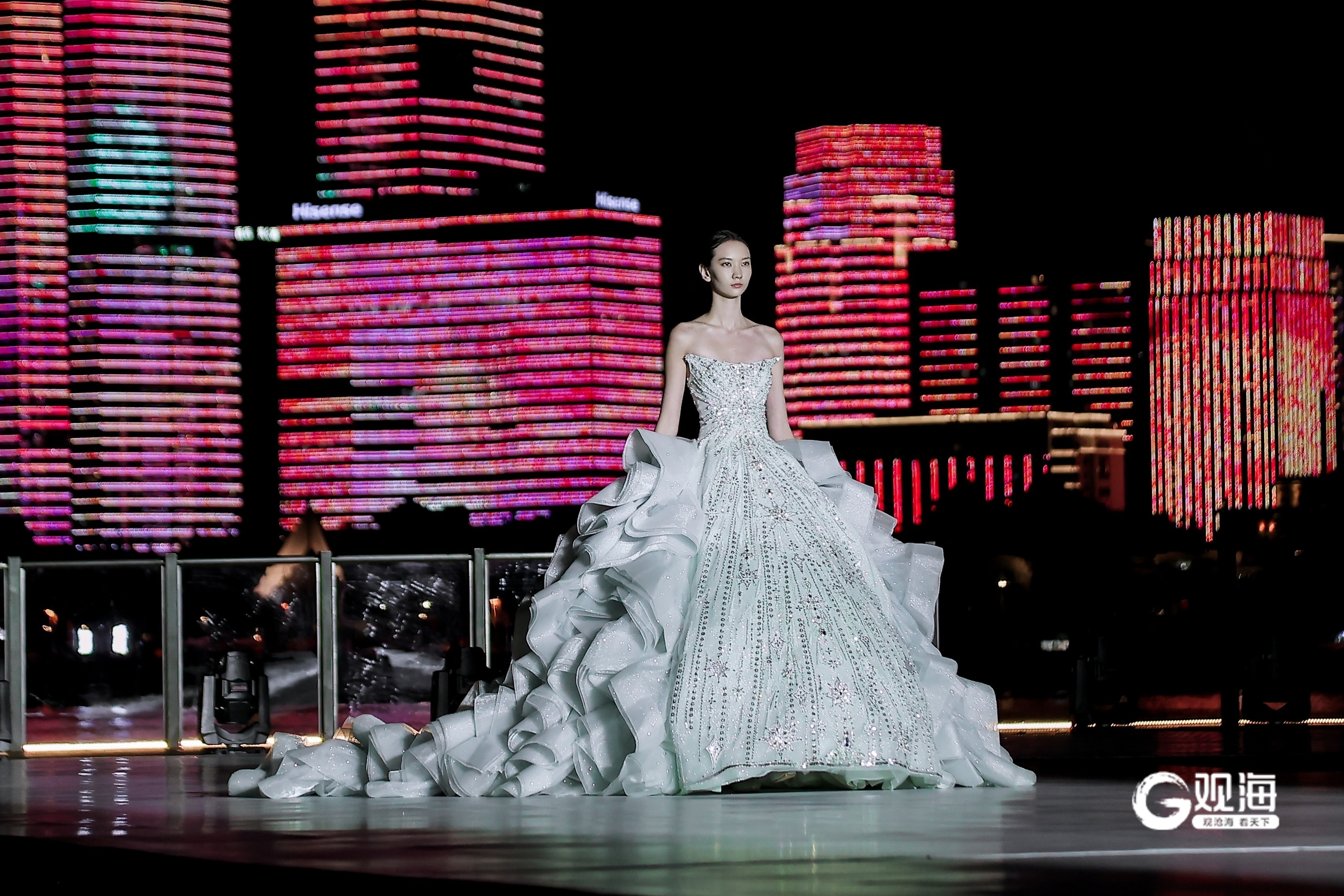 开幕秀由来自马来西亚吉隆坡的国际高端礼服婚纱品牌The Atelier带来,发布品牌2026春夏婚纱系列“羽翼生花Fleurs Crues Plumes”。该系列以简约奢华的设计诠释清丽、自由与浪漫。奥帆中心“海上剧场”上搭起的T台上,光影与裙缦轻纱在海天之间营造出旖旎的美学境界,模特们宛如从云端飘落的仙子,细腻的蕾丝如同轻柔的云雾,让观众感受到婚纱的浪漫与诗意。