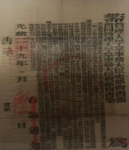 1903年发布的京师大学堂招生公告,是中国教育近代化开端的标志性文件原件,属于关键性历史物证,对于北京大学校史、中国教育史乃至清末新政史的研究,均具有无可替代的实物史料价值。